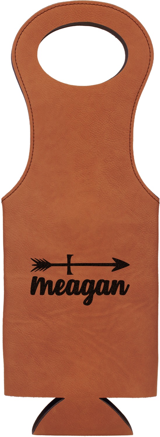 This wine carrier is made from a stunning leatherette, in a cognac-brown color. Strong, black stitching lines the sides of your wine bottle bag and provides extra durability. The interior is lined with a padded, black material to allow for a snug fit once your bottle is placed inside. At the top of this wine gift bag, you'll find two oval shaped handles that elegantly complements the rest of the bag's style. We provide you with the option of laser-engraving the front, or the front and back of your new personalized wine bag!