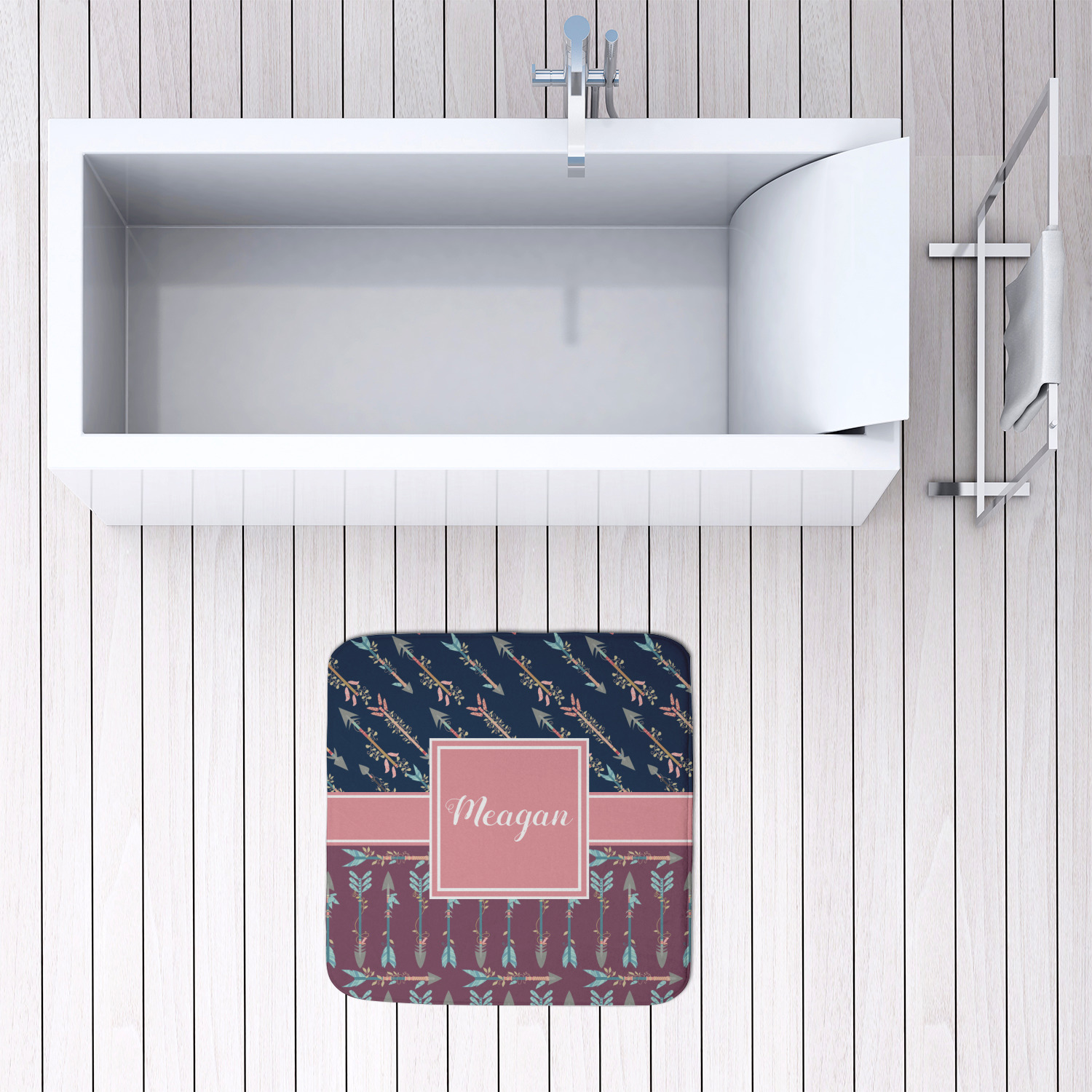We offer this custom bath mat in four different sizes, so that you can choose the proper size for your bathroom and shower space. We suggest measuring the area before so that you can make an informed purchase. The four sizes are as follows: 24 by 17 inches, 34 by 21 inches, 48 by 36 inches, and 48 by 48 inches.