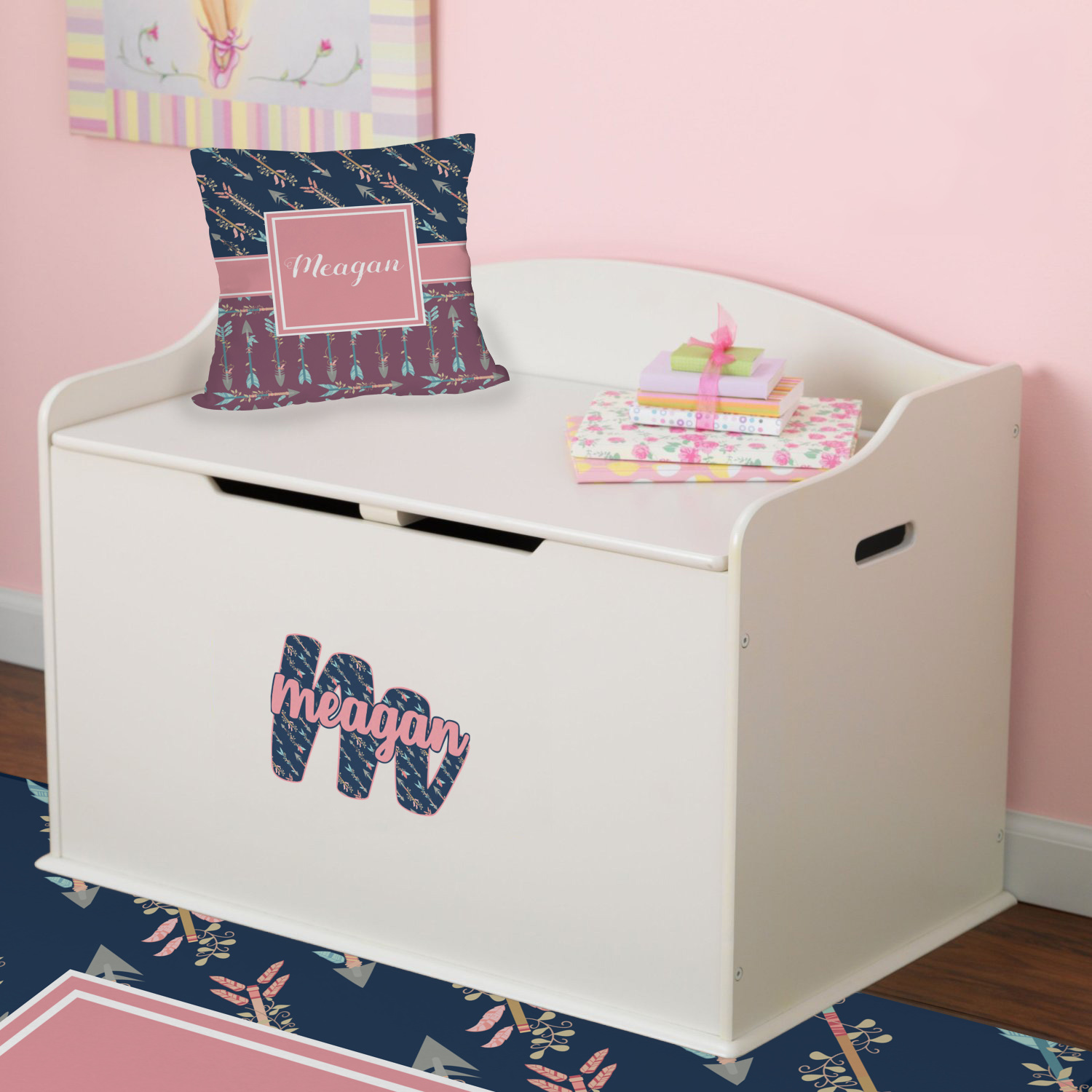 The cool navy blue and mauve really give this design a calming feeling. The two backgrounds have several different kinds of illustrative tribal arrows. Each one has slight variations in its beautiful detail. The soft blush ribbon and frame give a nice accent to both the navy and mauve. Put your very own personalization in the frame to get started.