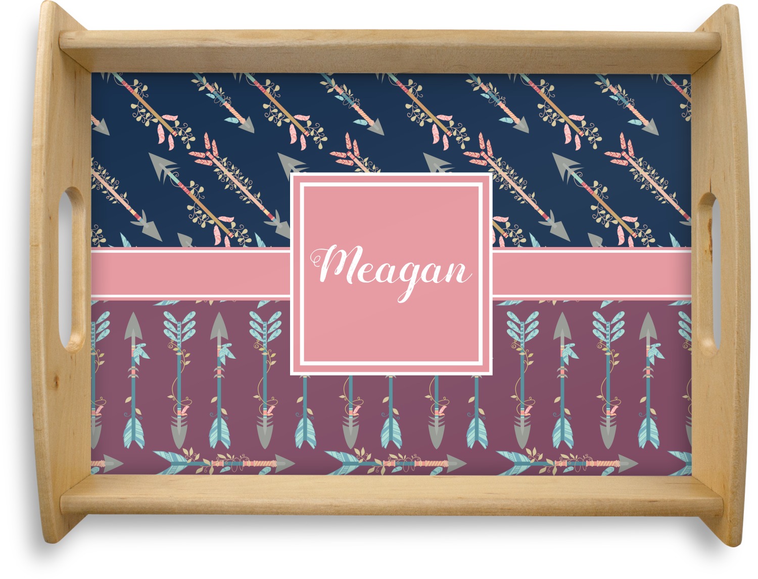 This serving tray with handles features square edges and two rounded sides, creating a very modern look. Each side is fabricated from a beautifully cut, natural wood. The bottom of the interior of the tray displays your customized design in bright, vibrant color. The tray is sold in both a black color and a natural wood look. Each variation of the wood serving tray has two sizes: Small, which is 14" x 10" x 2.25", and Large, which is 19.5" x 13.5" x 2.75".