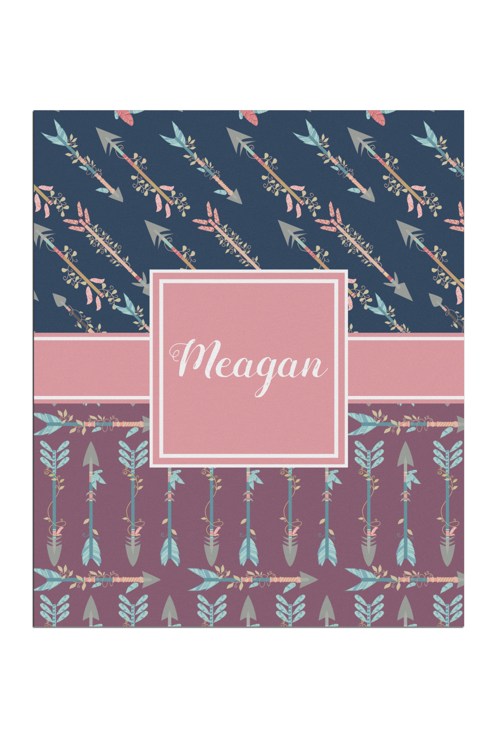 The cool navy blue and mauve really give this design a calming feeling. The two backgrounds have several different kinds of illustrative tribal arrows. Each one has slight variations in its beautiful detail. The soft blush ribbon and frame give a nice accent to both the navy and mauve. Put your very own personalization in the frame to get started.