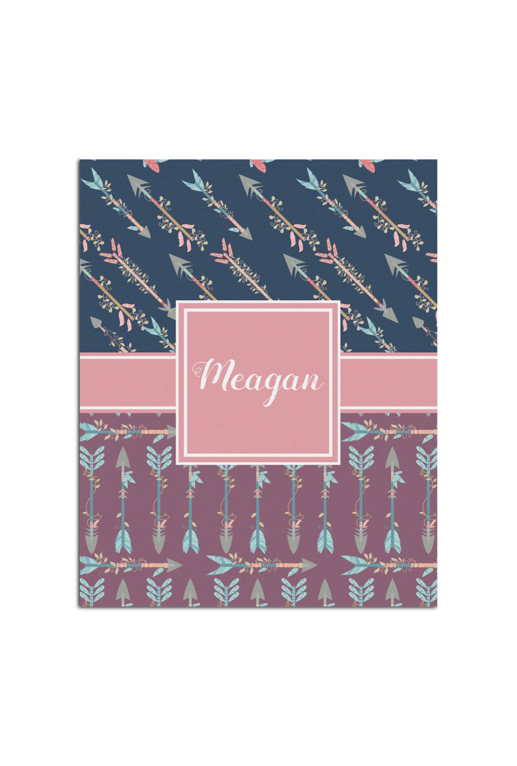 The cool navy blue and mauve really give this design a calming feeling. The two backgrounds have several different kinds of illustrative tribal arrows. Each one has slight variations in its beautiful detail. The soft blush ribbon and frame give a nice accent to both the navy and mauve. Put your very own personalization in the frame to get started.