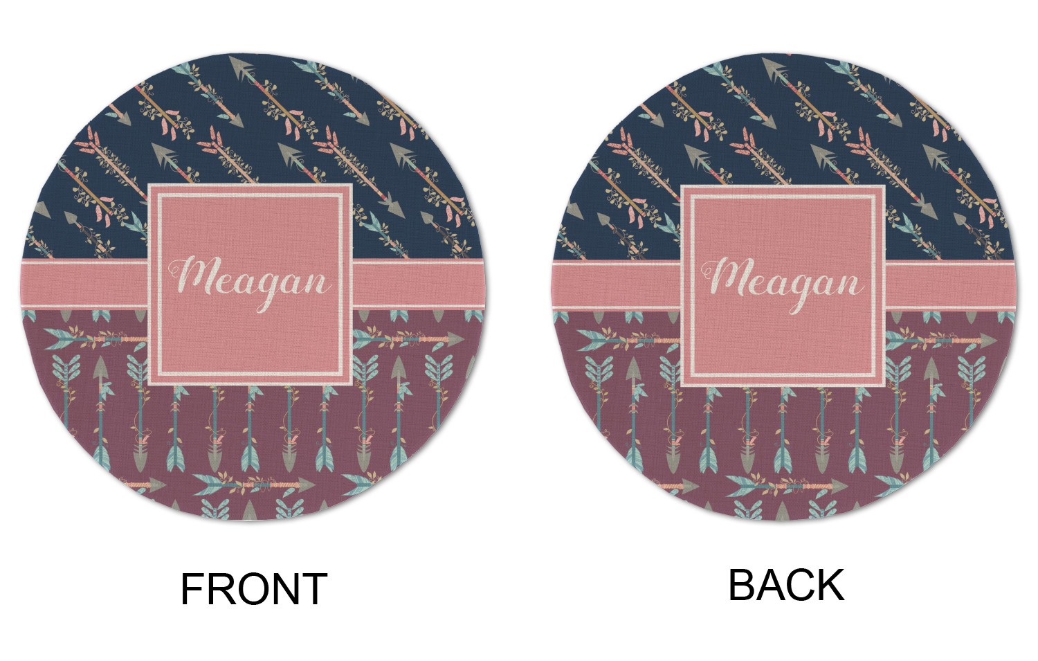 The cool navy blue and mauve really give this design a calming feeling. The two backgrounds have several different kinds of illustrative tribal arrows. Each one has slight variations in its beautiful detail. The soft blush ribbon and frame give a nice accent to both the navy and mauve. Put your very own personalization in the frame to get started.