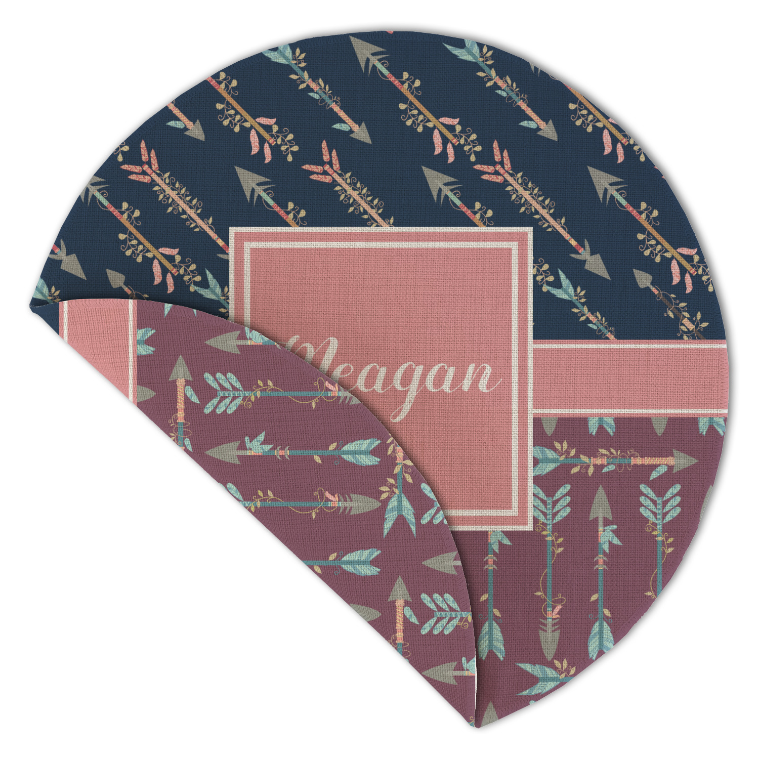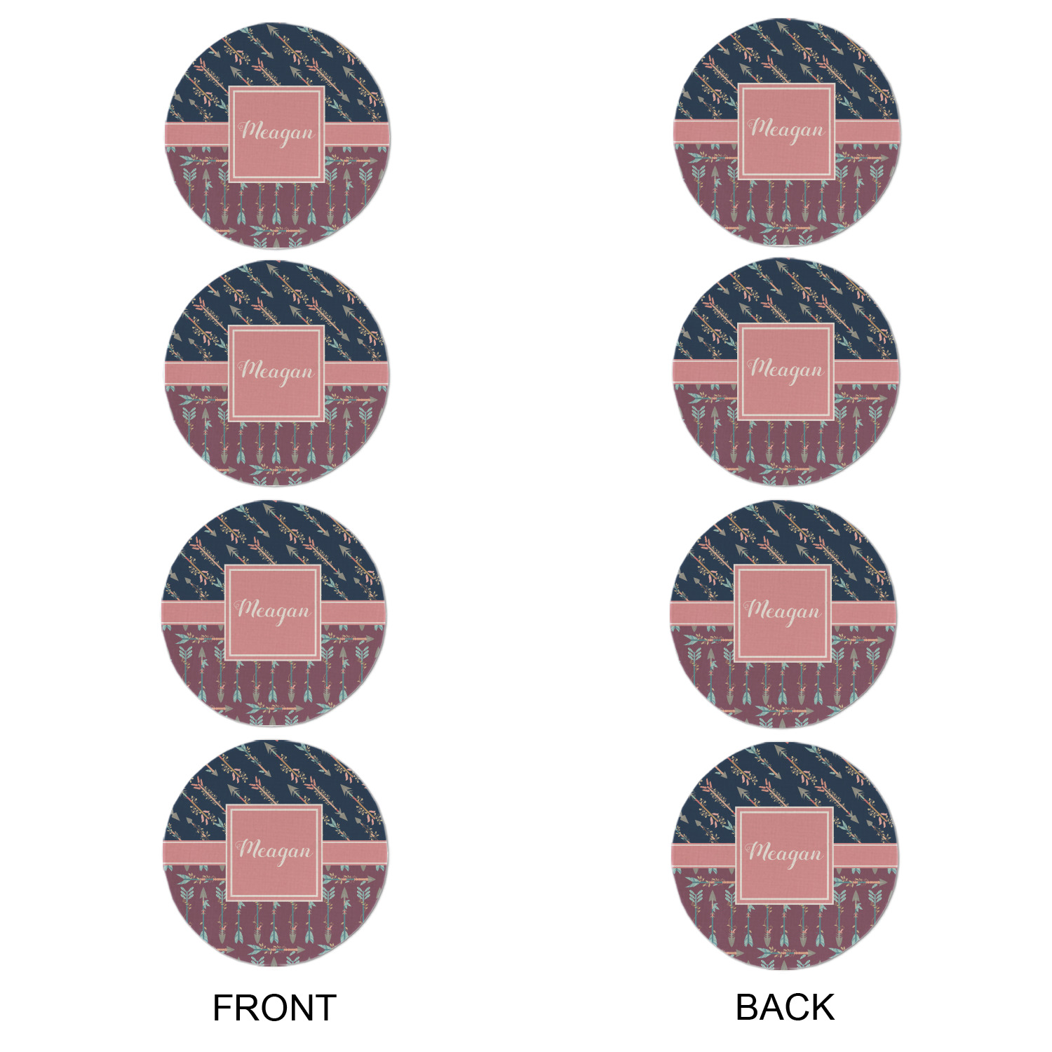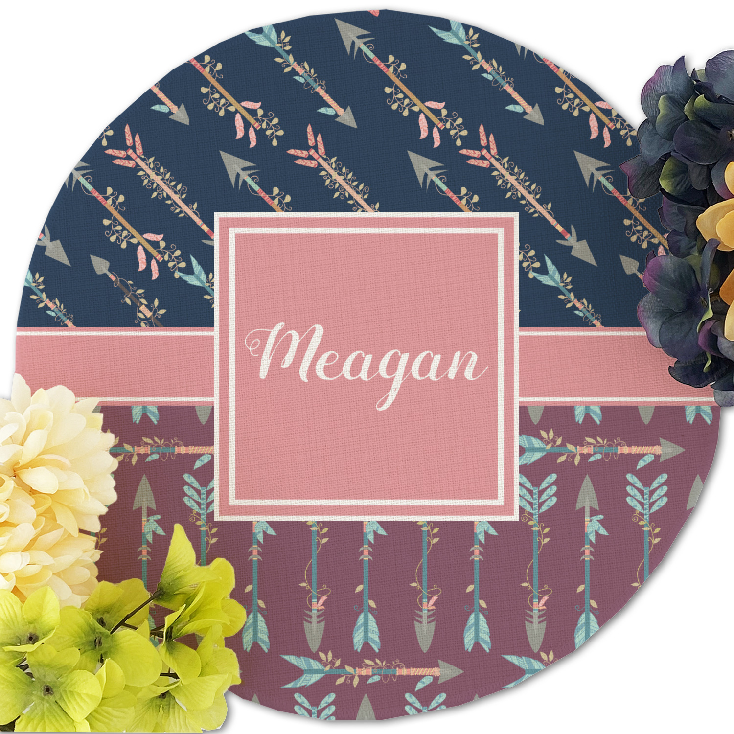 The cool navy blue and mauve really give this design a calming feeling. The two backgrounds have several different kinds of illustrative tribal arrows. Each one has slight variations in its beautiful detail. The soft blush ribbon and frame give a nice accent to both the navy and mauve. Put your very own personalization in the frame to get started.