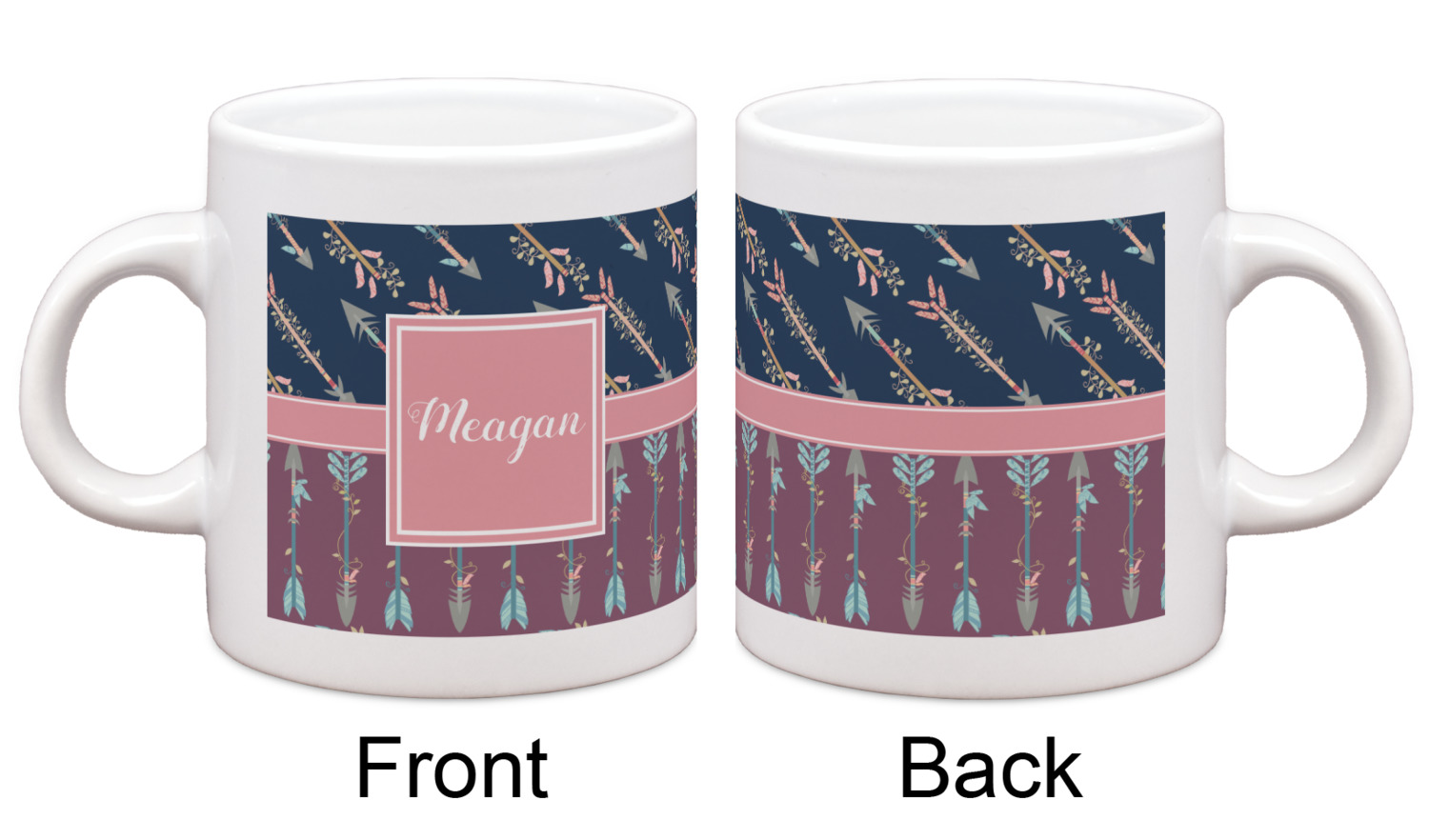 The cool navy blue and mauve really give this design a calming feeling. The two backgrounds have several different kinds of illustrative tribal arrows. Each one has slight variations in its beautiful detail. The soft blush ribbon and frame give a nice accent to both the navy and mauve. Put your very own personalization in the frame to get started.