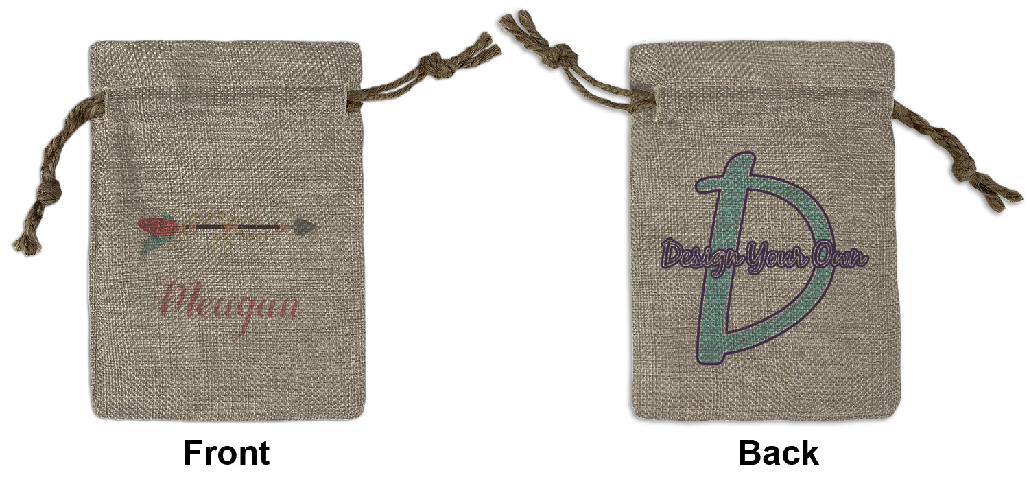 We sell our Burlap Gift Bags in 3 variant sized bags. Made with burlap polyester, each personalized bag can be secured with a twine drawstring pull. Your custom design is available to print on one side or both sides - completely up to you! The sizes of the bags measure approximately 4.5" x 6.5" for the smallest size, 6.5" x 8.0" for the medium size, and 6.5" x 13.5" for the large-sized bag.