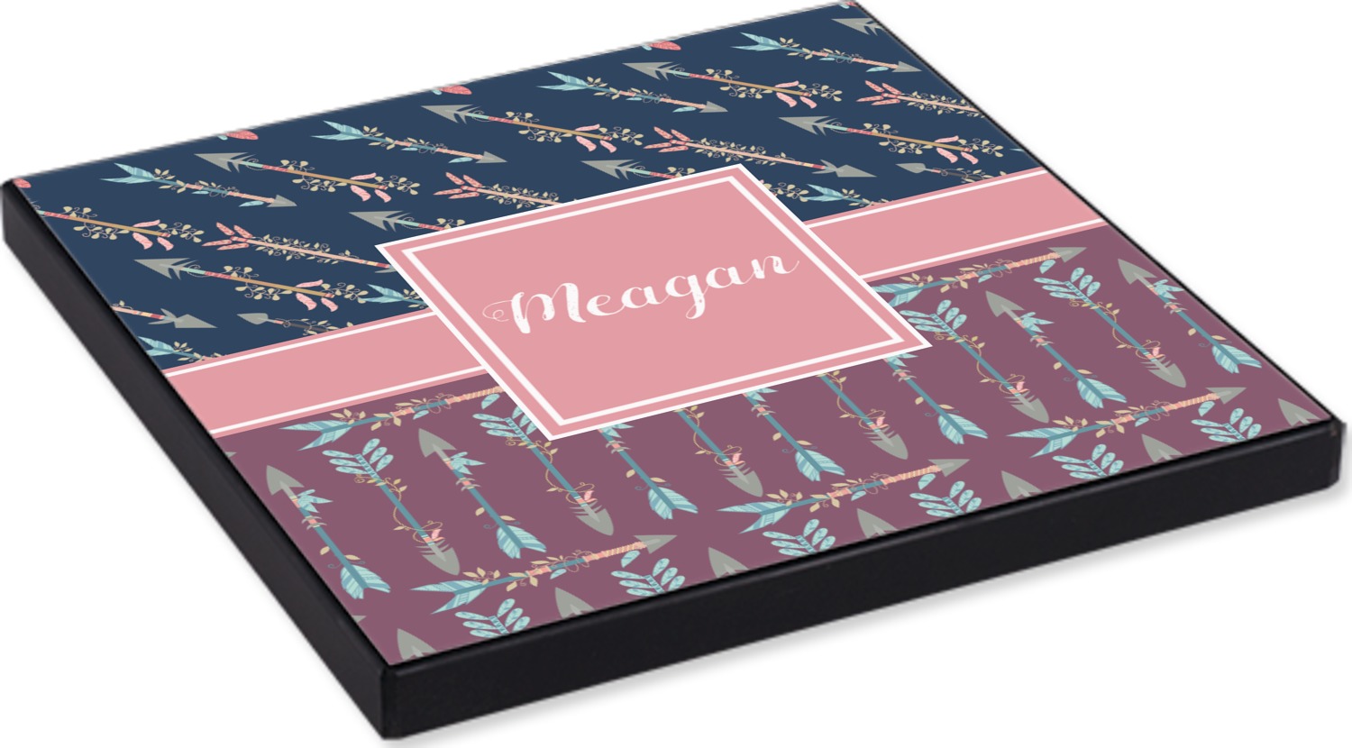 The cool navy blue and mauve really give this design a calming feeling. The two backgrounds have several different kinds of illustrative tribal arrows. Each one has slight variations in its beautiful detail. The soft blush ribbon and frame give a nice accent to both the navy and mauve. Put your very own personalization in the frame to get started.