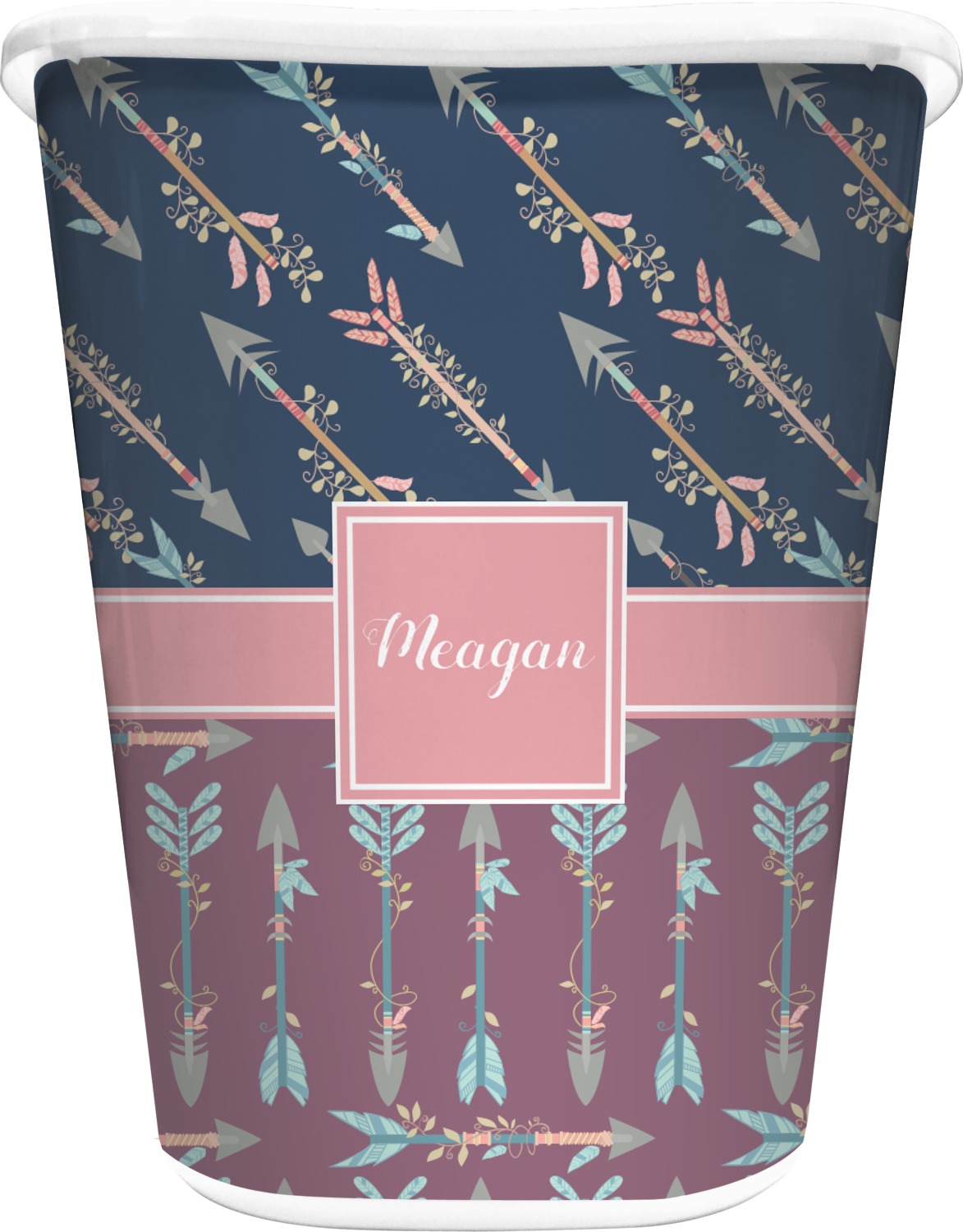 The cool navy blue and mauve really give this design a calming feeling. The two backgrounds have several different kinds of illustrative tribal arrows. Each one has slight variations in its beautiful detail. The soft blush ribbon and frame give a nice accent to both the navy and mauve. Put your very own personalization in the frame to get started.