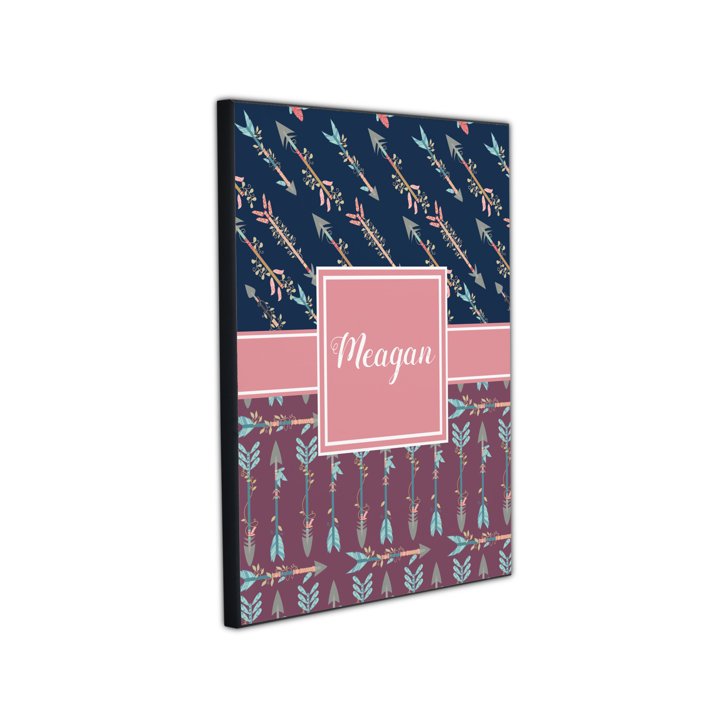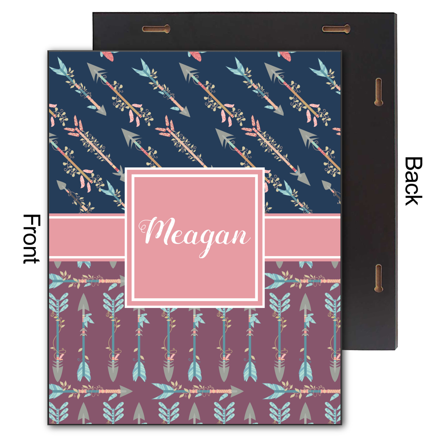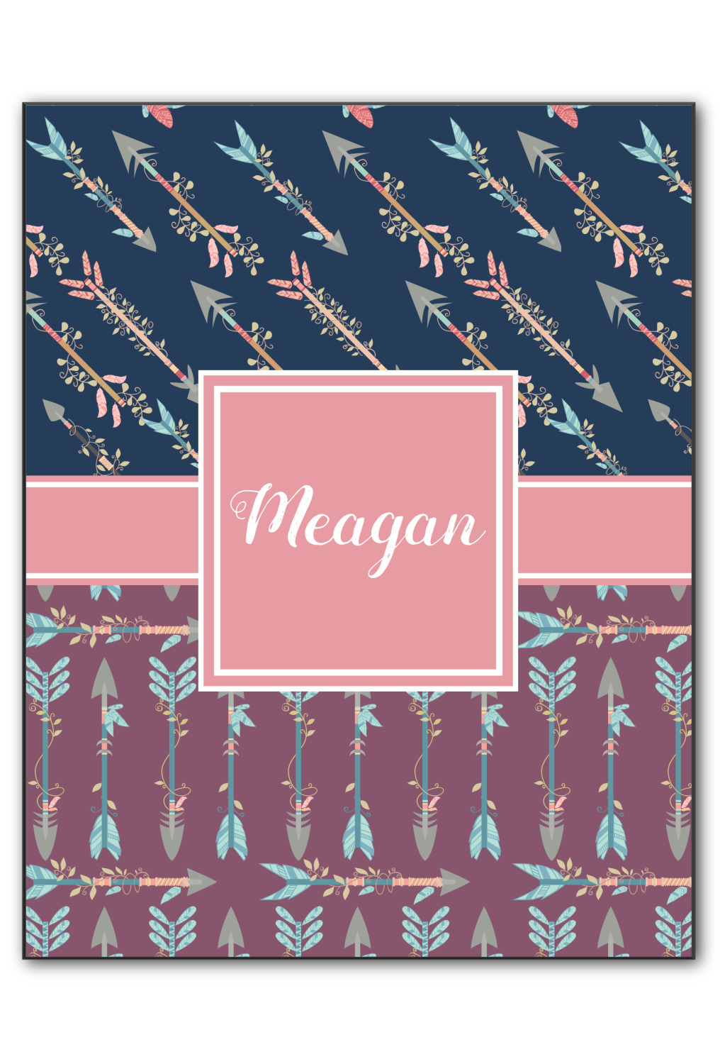 The cool navy blue and mauve really give this design a calming feeling. The two backgrounds have several different kinds of illustrative tribal arrows. Each one has slight variations in its beautiful detail. The soft blush ribbon and frame give a nice accent to both the navy and mauve. Put your very own personalization in the frame to get started.