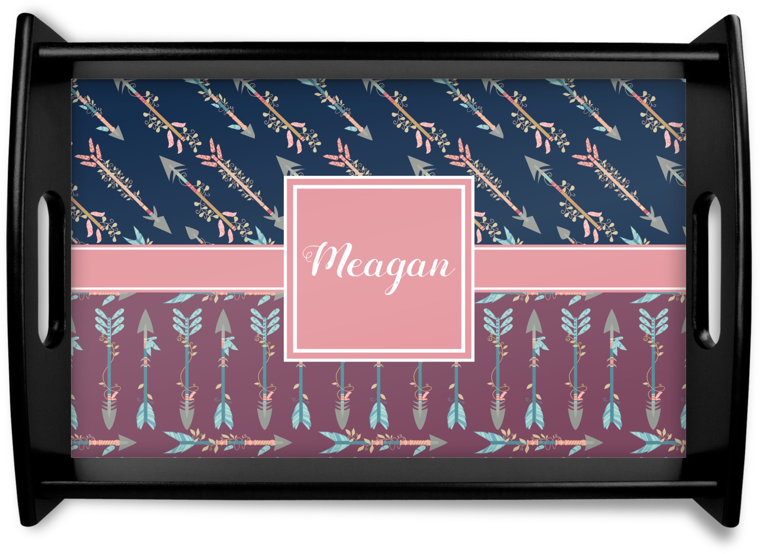 This serving tray with handles features square edges and two rounded sides, creating a very modern look. Each side is fabricated from a beautifully cut, natural wood. The bottom of the interior of the tray displays your customized design in bright, vibrant color. The tray is sold in both a black color and a natural wood look. Each variation of the wood serving tray has two sizes: Small, which is 14" x 10" x 2.25", and Large, which is 19.5" x 13.5" x 2.75".