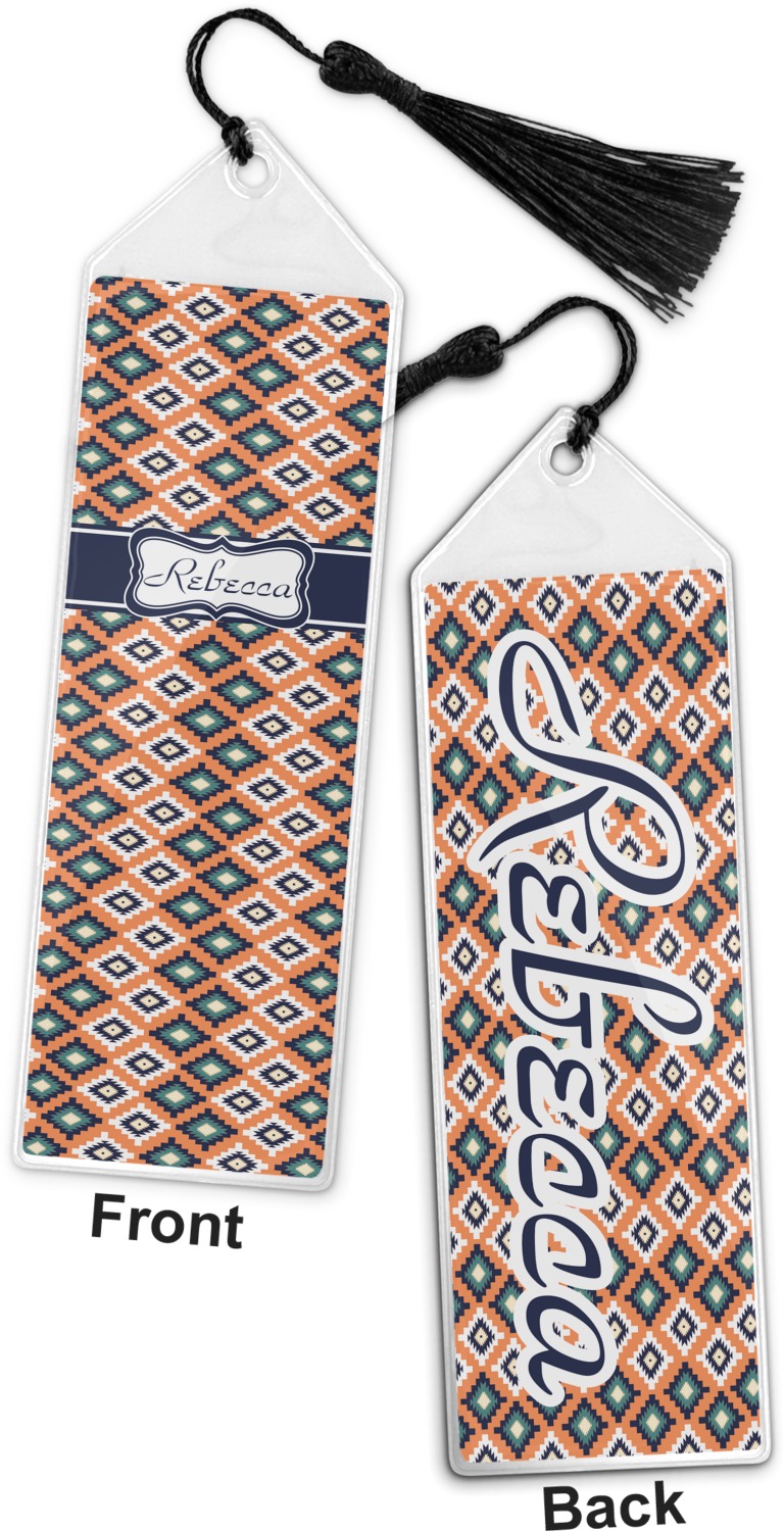 Your personalized bookmark is made of a sturdy, clear vinyl, and is approximately 7.5" x 2.25". We display your personalization on vinyl inserts that are placed on both sides. Accompanying each book marker is a black, fringe tassel that attaches to the reinforced, triangular header.