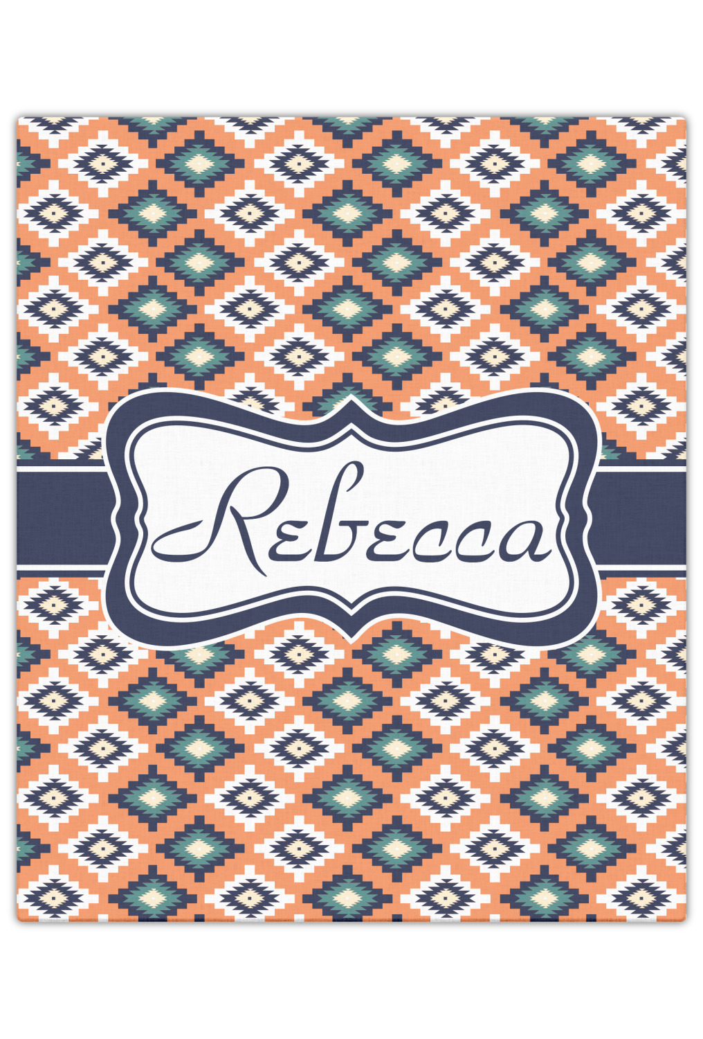 This fun, tribal design features stitched diamonds in cream and blue, scattered across a pale orange background. The effect is rather mesmerizing.