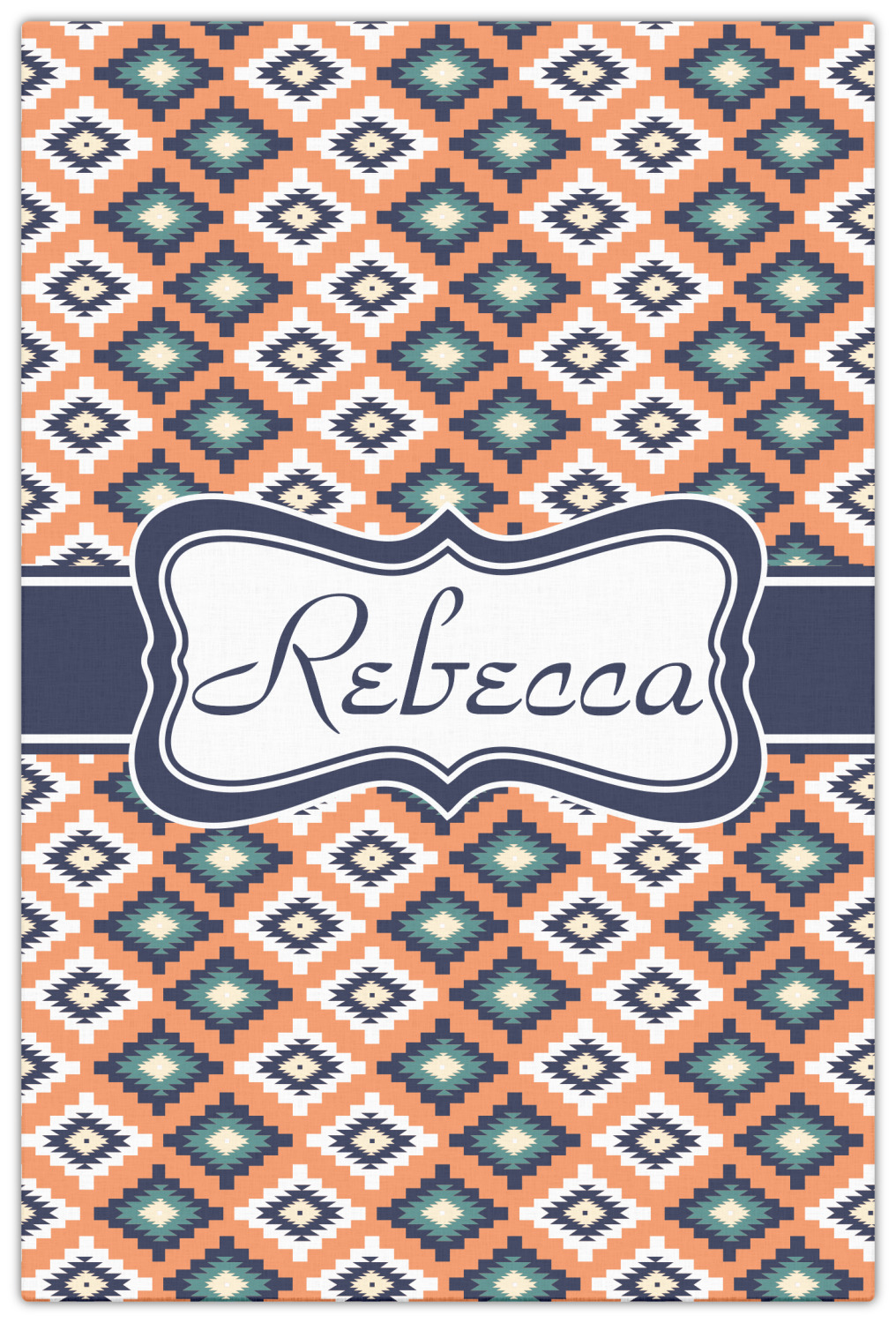 This fun, tribal design features stitched diamonds in cream and blue, scattered across a pale orange background. The effect is rather mesmerizing.