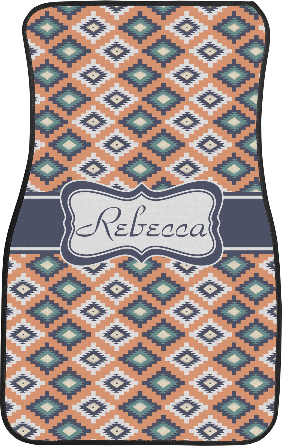 This fun, tribal design features stitched diamonds in cream and blue, scattered across a pale orange background. The effect is rather mesmerizing.