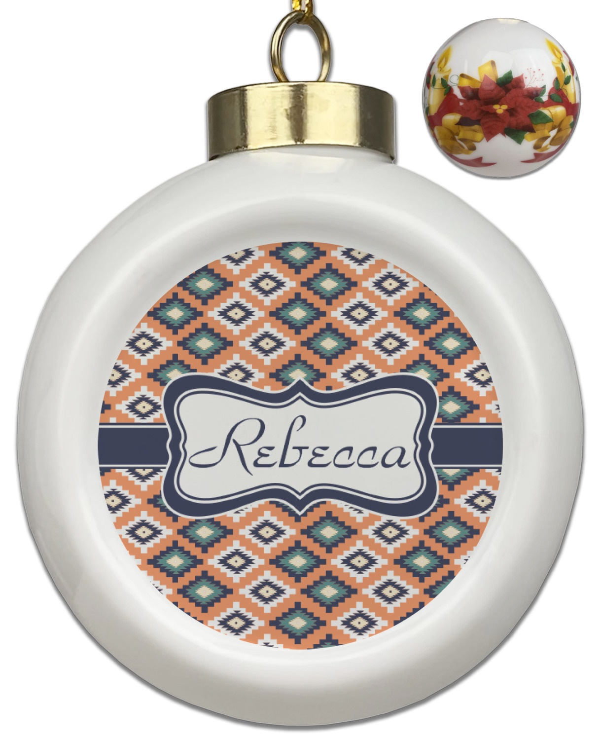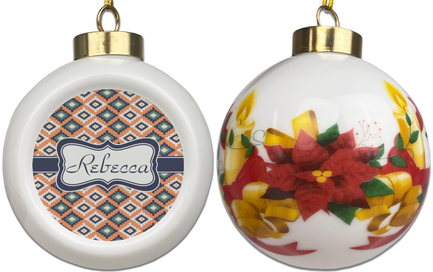 Our Christmas ornaments are a unique ceramic ball shape with a twist as it has a flat face to display your custom design! Select from one of our two design types - Christmas Tree or Poinsettia Garland - to adorn the curved back of your personal design. Each ornament measures 3H x 2.5W x 2D accompanied with a gold string accent for finishing touches to hang on your beautiful Christmas tree!
