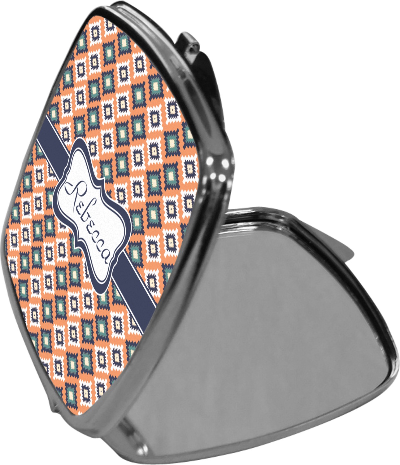 Our compact mirrors are customized with your design on one side. The other side is patterned silver tone metal. Inside, there are two mirrors.
