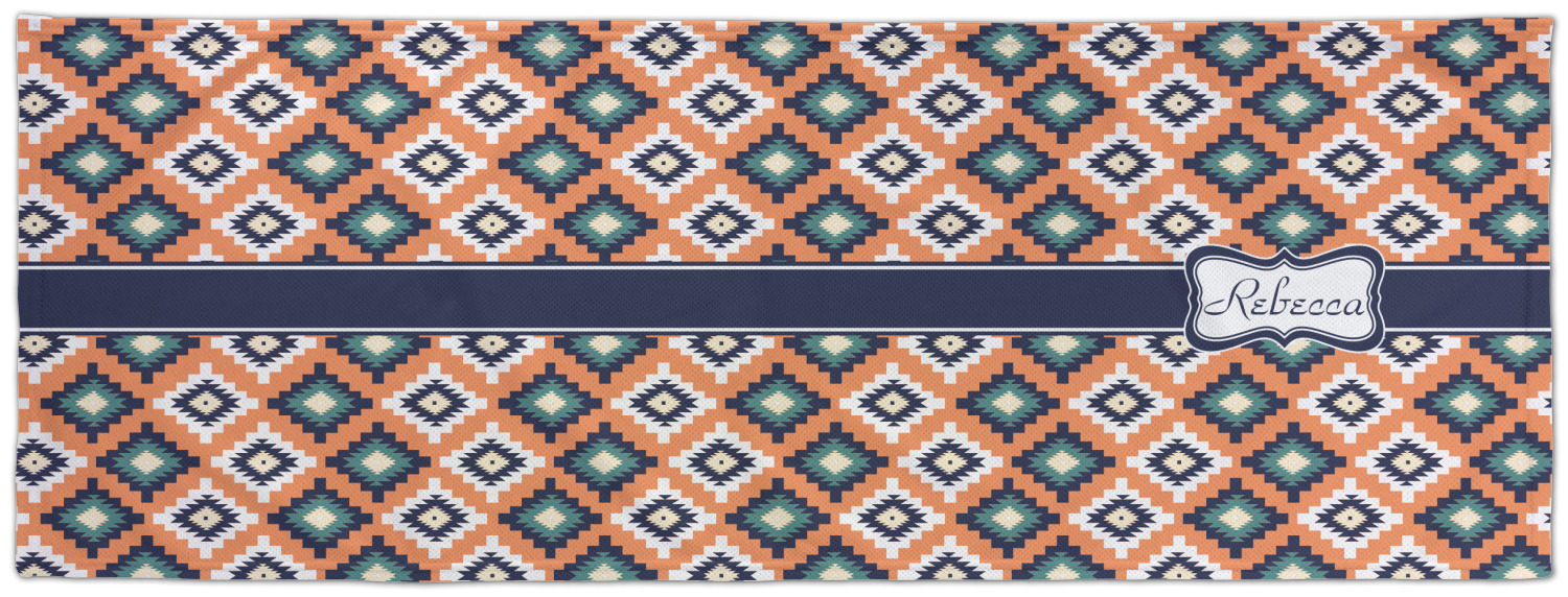 This fun, tribal design features stitched diamonds in cream and blue, scattered across a pale orange background. The effect is rather mesmerizing.