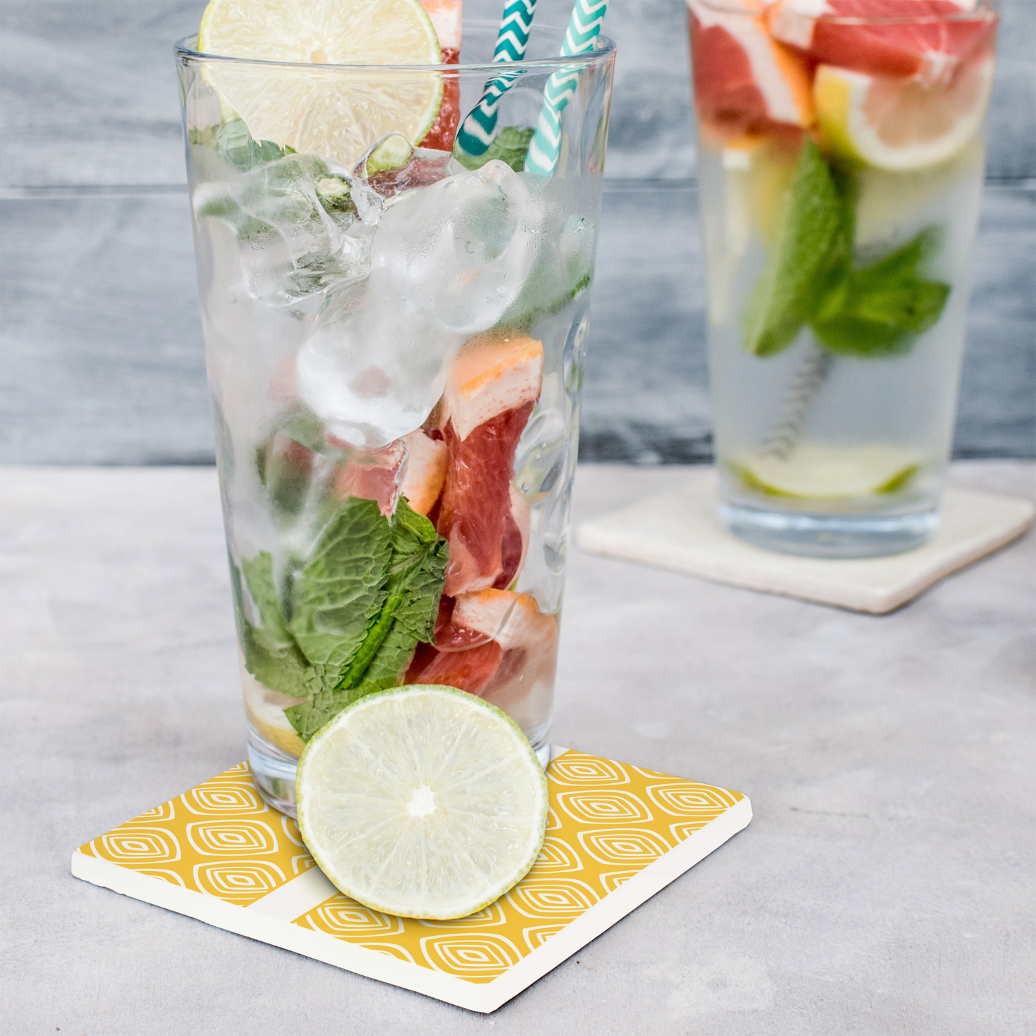 Our super absorbent stone coasters absorb the condensation into the coaster, before it has a chance to flow on to your furniture or table tops, thus preventing watermarks and blemishes.