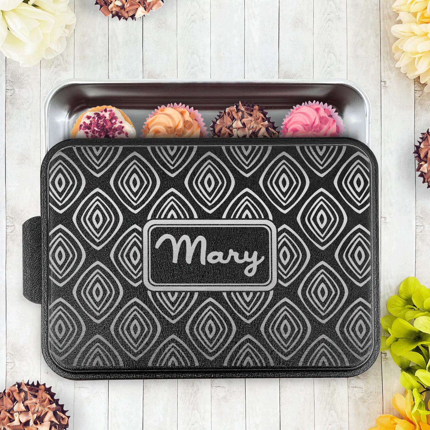 With the lid laser etched with the design of your choice these get the fully customized touch unique to you. The possibilities are endless when you go to design your own cake pan lid. With our design library you can make the design of your dreams come true.