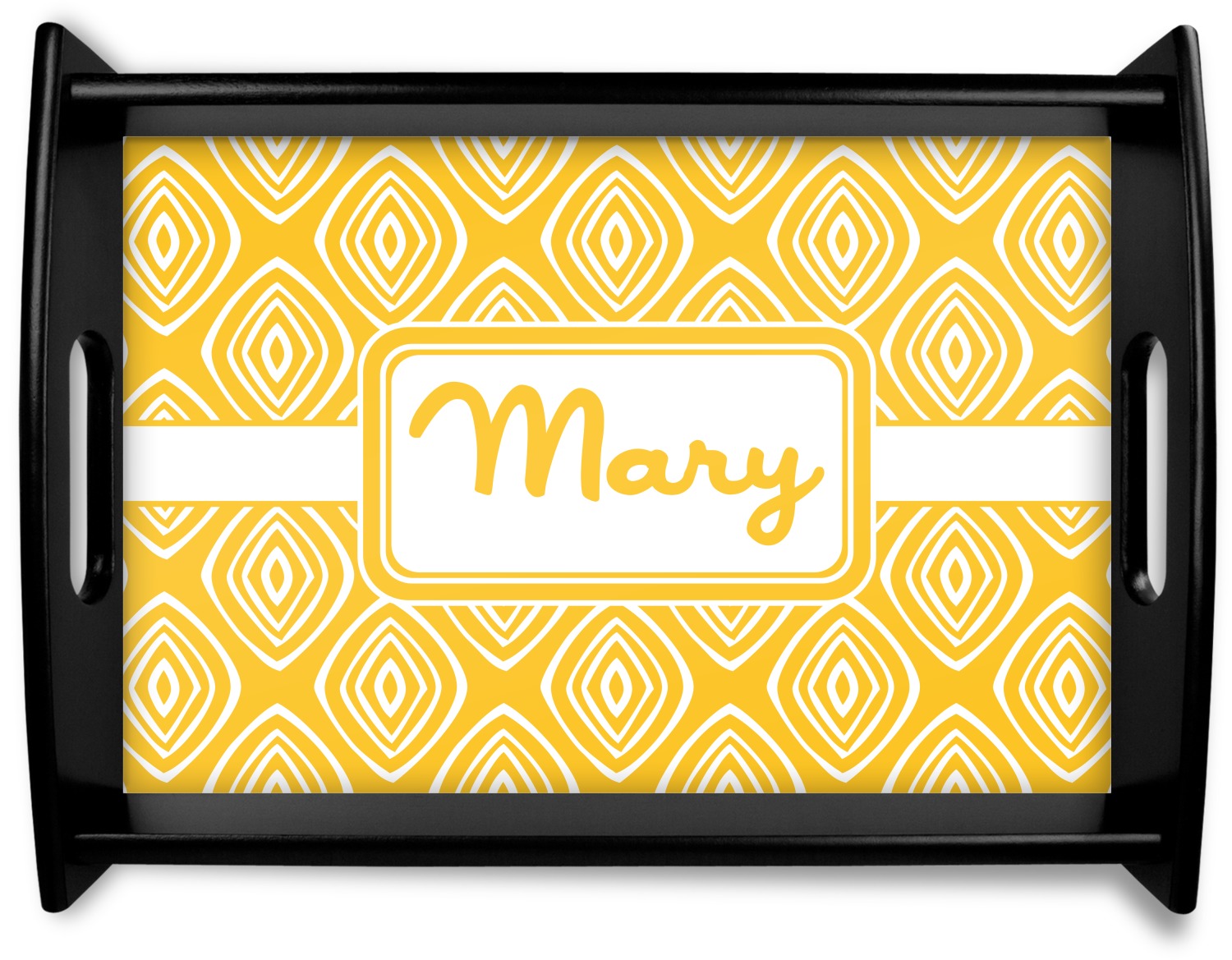 This serving tray with handles features square edges and two rounded sides, creating a very modern look. Each side is fabricated from a beautifully cut, natural wood. The bottom of the interior of the tray displays your customized design in bright, vibrant color. The tray is sold in both a black color and a natural wood look. Each variation of the wood serving tray has two sizes: Small, which is 14" x 10" x 2.25", and Large, which is 19.5" x 13.5" x 2.75".