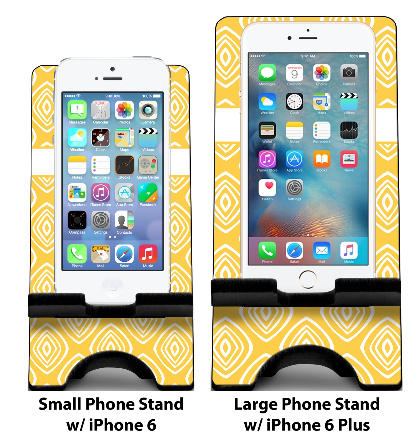 To meet your needs, we offer four variations of this IPhone stand. The backboard of the first version is shaped as a plain, yet sleek rectangle, and is available in two sizes. Our smaller size is approximately 4 by 3.25 by 7 inches, while the larger model is 4 by 3.77 by 8.5 inches. Alongside this model, we also provide you with a more decorative option. The upper part of our second version features a curved edge, for a classy, suave appearance. This phone holder is also sold in two sizes: a smaller version, which is 4 by 3.25 by 7 inches, and our larger model, which is 4 by 3.77 by 8.5 inches. Both models will support large phones, but the larger model is better if you wish to proudly display your personalized design.