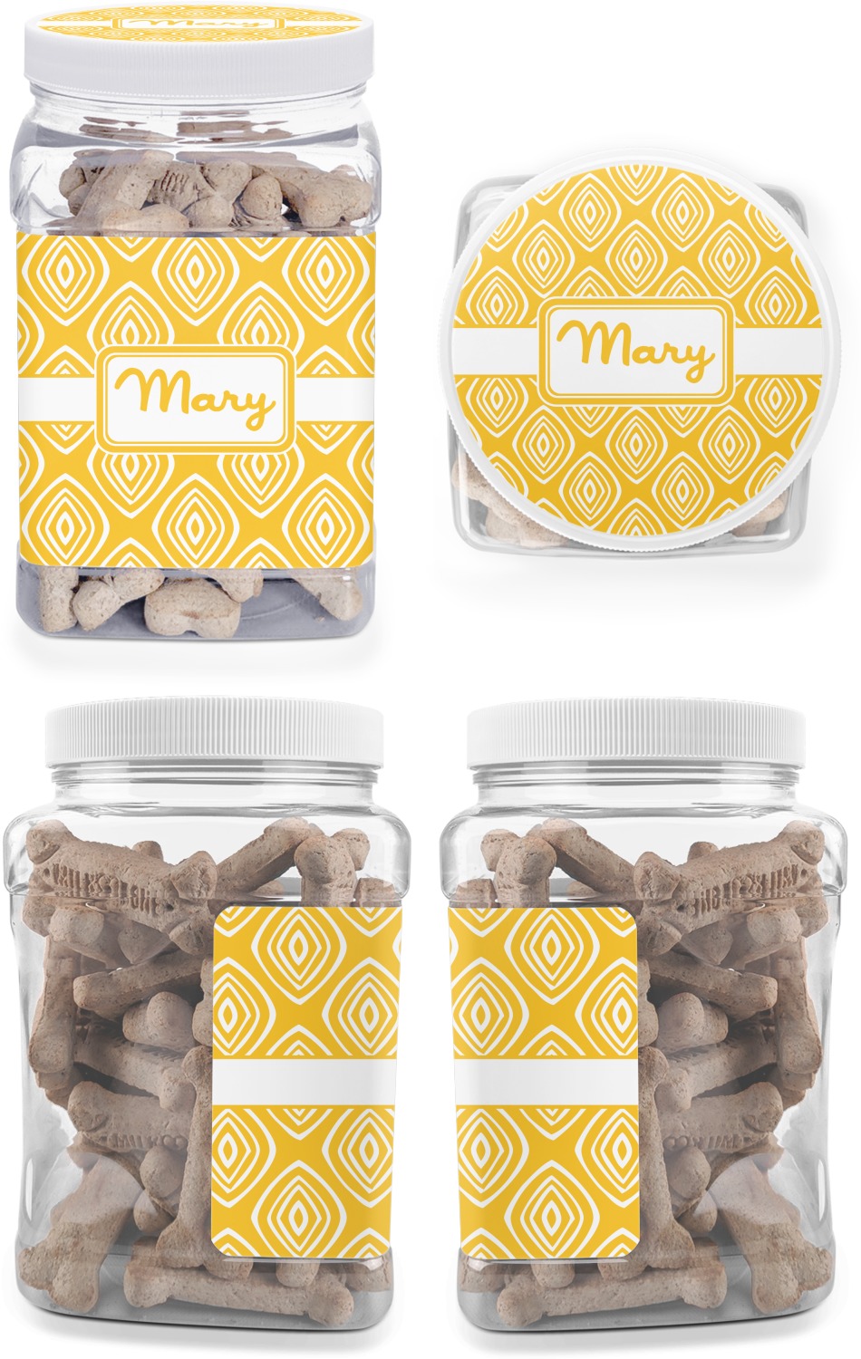 This half gallon jar, made from a sturdy plastic, is the perfect way to keep treats from any naughty pet paws, while still keeping them ready on hand for when your pup performs an impressive trick. This dog cookie jar features a screw-on, white lid that displays your personalized design on a vinyl sticker. We apply another customized sticker that wraps around the front and sides of the jar. Our dog treat jar also has indentations on the rear ends of the sides, which allows for convenient handling, and its square frame allows for easy storage.