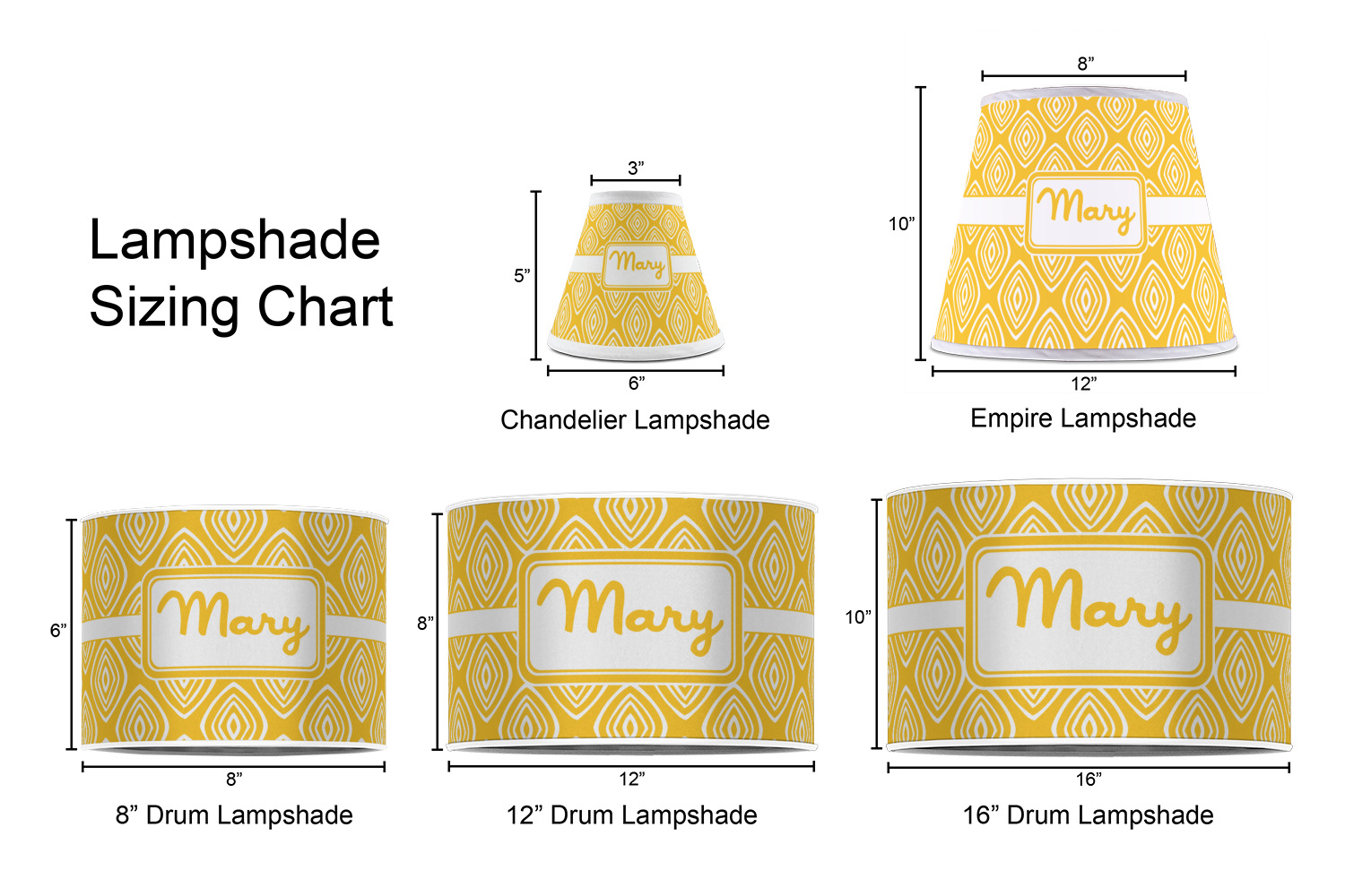 Our customized lamp shades also come in 3 different sizes: 8", 12" and 16", measuring at 8" in diameter by 6" tall, 12" in diameter by 8" tall, and 16" in diameter by 10" tall, respectively.