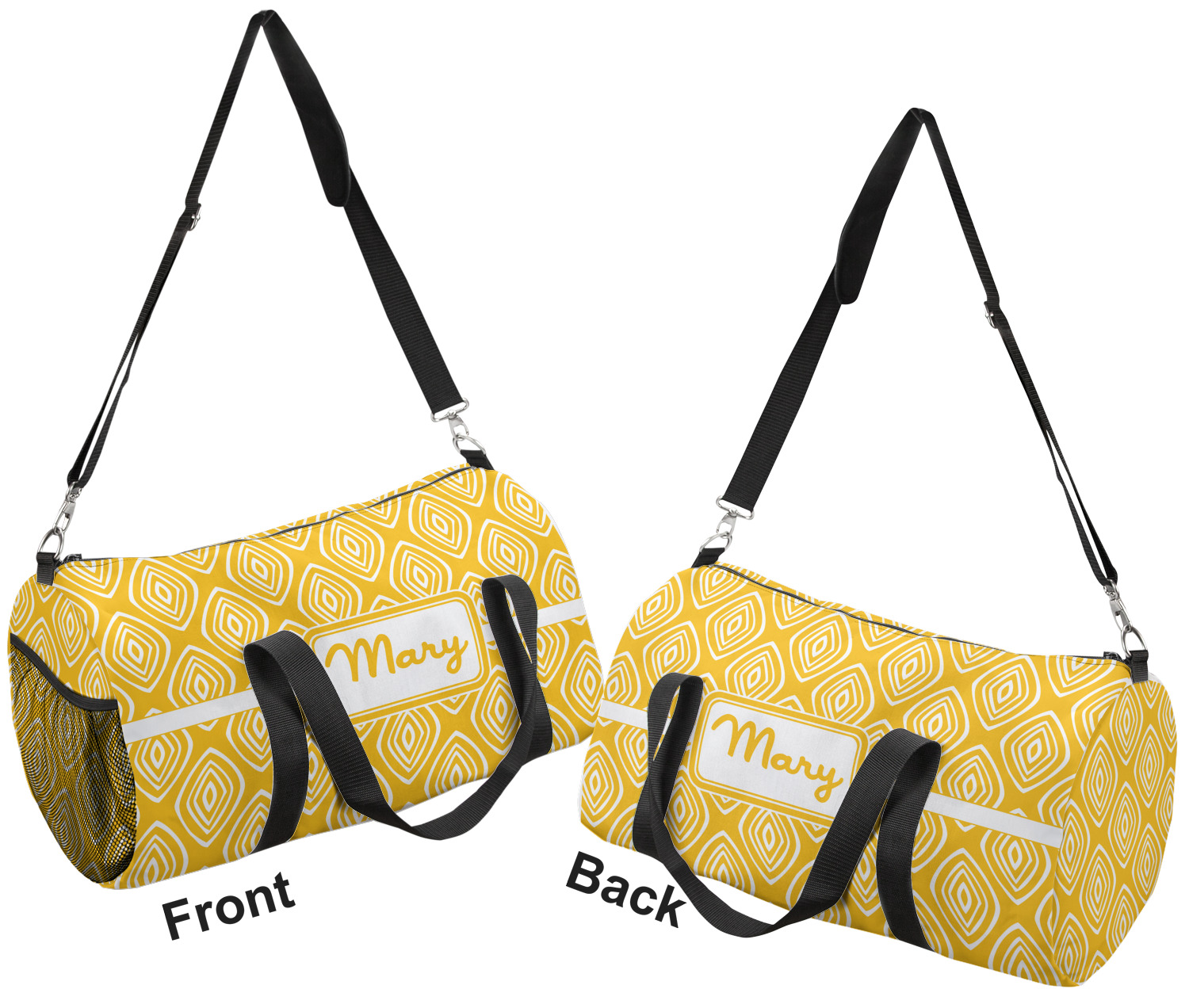 This duffle is a sturdy bag made of a canvas material. It comes in two sizes: Small (19"W x 9.5"H x 9.5"D) and Large (23"W x 12"H x 12"D). The bag is a cylindrical shape with a black adjustable strap and two handles. On one side is an elastic pouch to put a waterbottle or other small item. Your product will be sublimated with your design and is able to be designed on the front, back, and sides. Be sure to remember that the straps may cut into parts of your design if you upload your own artwork.