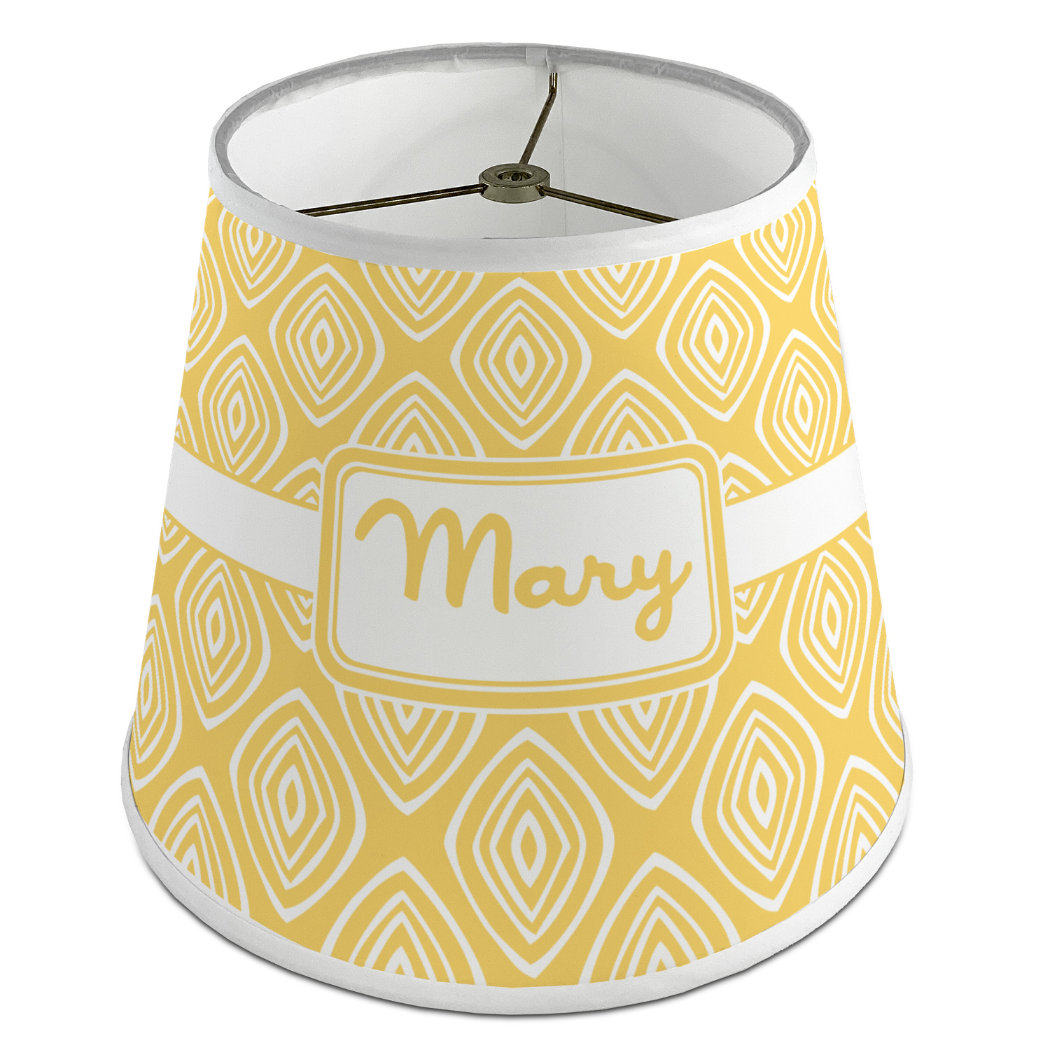 The base of this lampshade is 12 inches in diameter, and the top spans 8 inches in diameter. The total height of the lampshade is 10 inches. The angled nature of this custom lampshade concentrates the light, making it ideal for smaller spaces. This lampshade is made of matte, polyfilm, and displays your customization in its middle. The top and bottom of this colorful lamp shade are lined with a white fabric ribbon (which can be replaced with black inside the design studio) which frames your design and creates a sophisticated finish. As an UNO fitter lampshade, this unique lamp shade will fit a variety of bases.