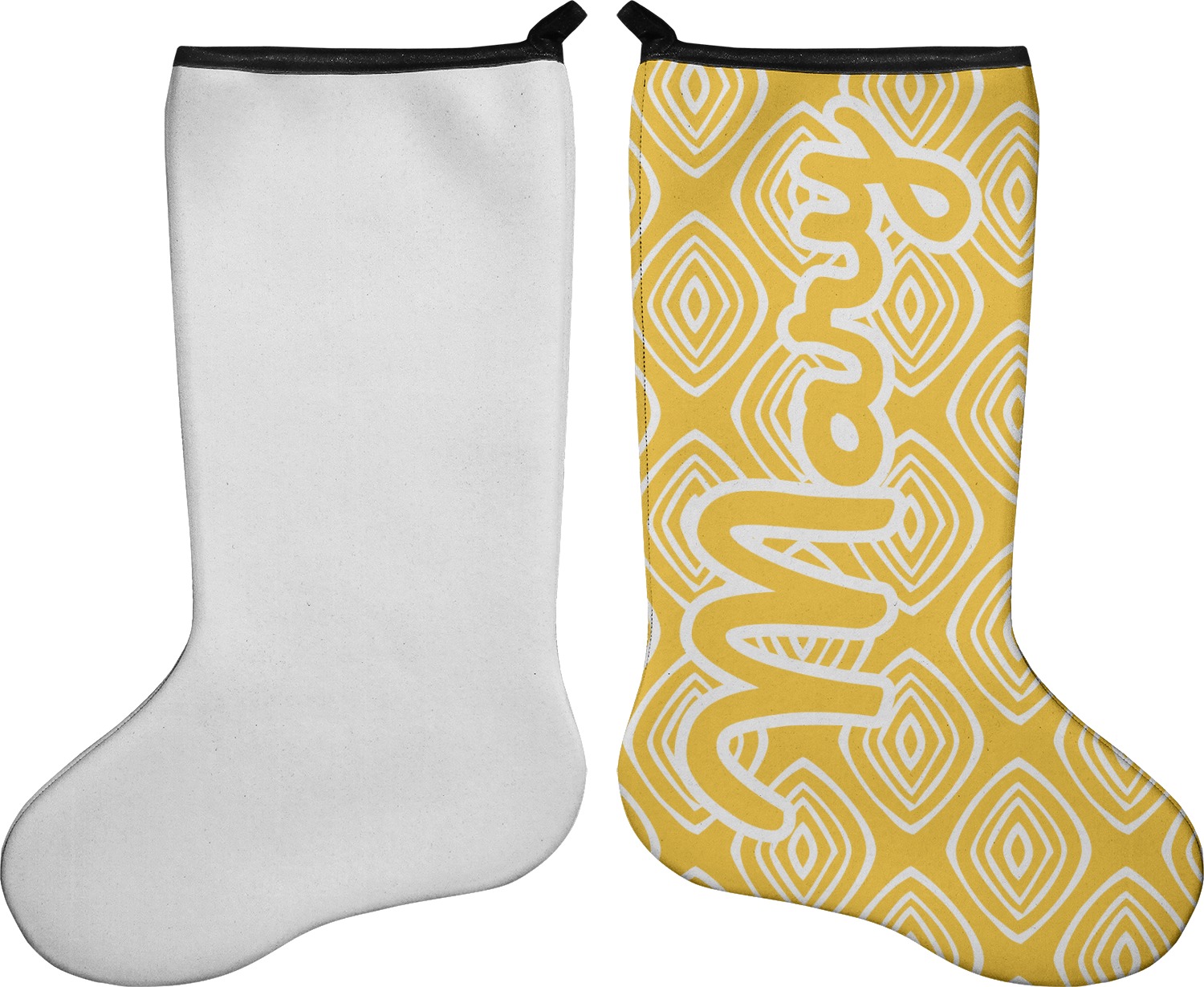 These 17" x 11" stockings are made of neoprene and have a black trim to give them a fantastic finished look. Your very own design is printed right onto the stocking, either single sided with white on the back or double sided where can use the same or different designs / patterns on the front and the back - the choice is yours. At the top of the stocking is a 2" loop for hanging.