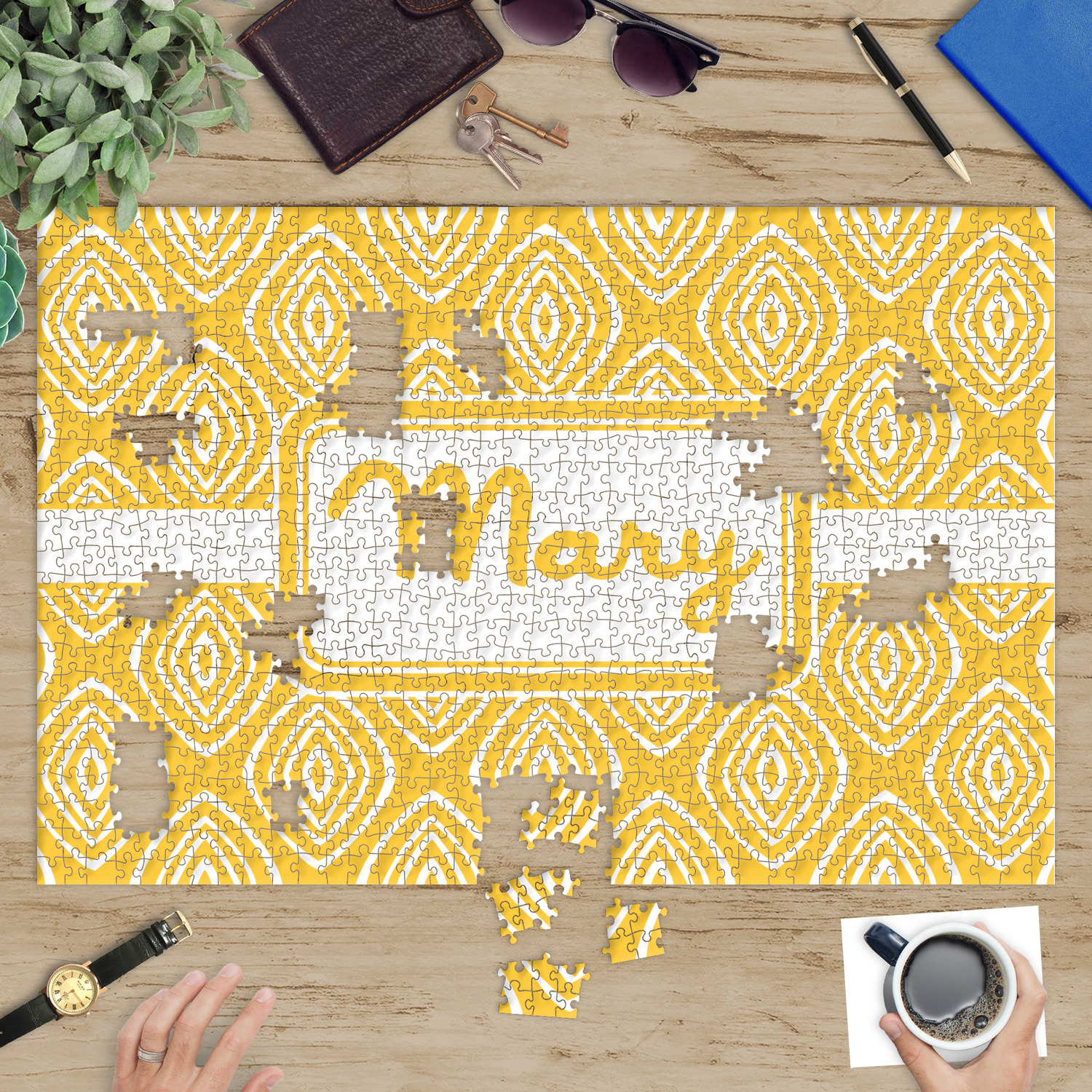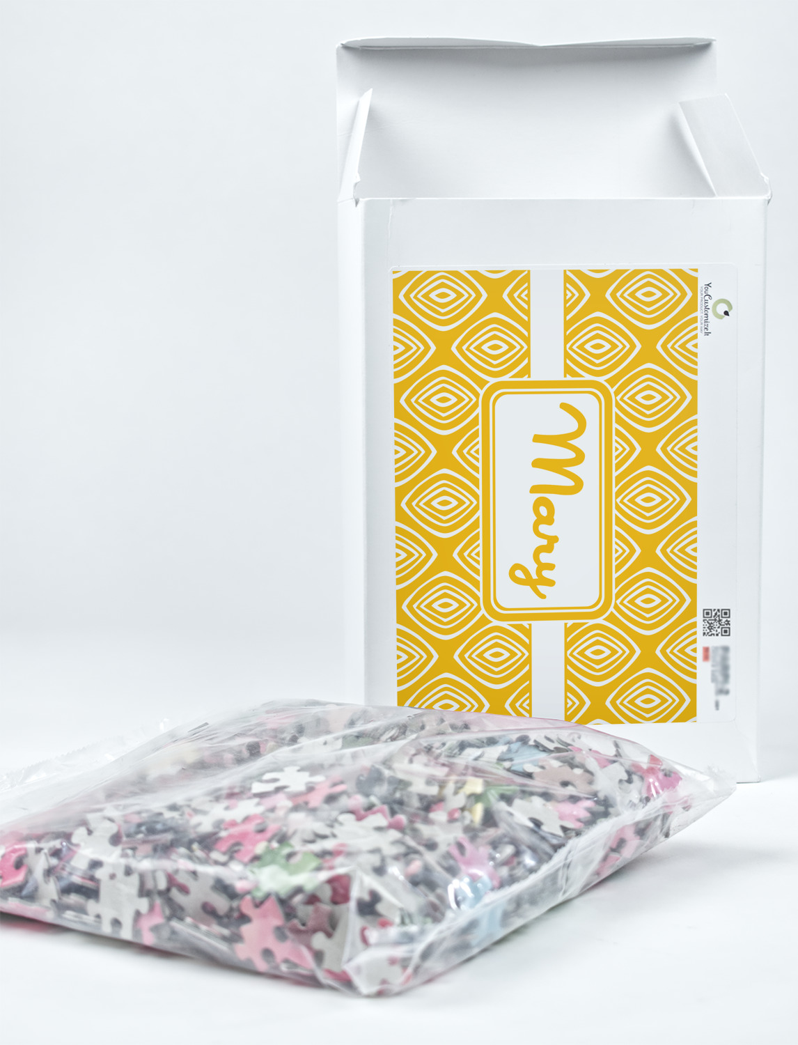 You can also upload your logo or art that you or your kids drew. To create more challenging jigsaw puzzles, you can create a pattern from with your logo or artwork. You can also add other elements such as text or personalization.
