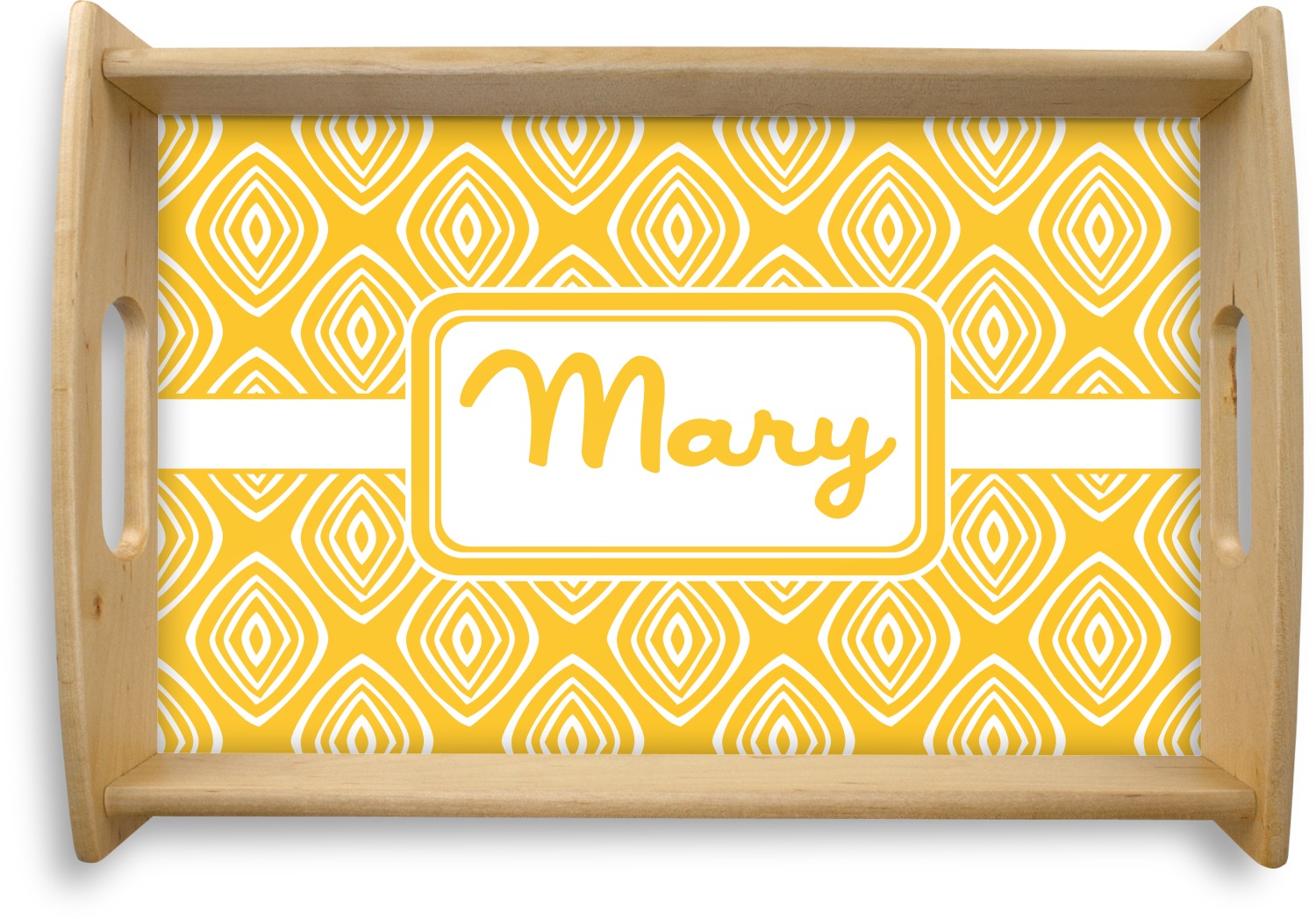 This serving tray with handles features square edges and two rounded sides, creating a very modern look. Each side is fabricated from a beautifully cut, natural wood. The bottom of the interior of the tray displays your customized design in bright, vibrant color. The tray is sold in both a black color and a natural wood look. Each variation of the wood serving tray has two sizes: Small, which is 14" x 10" x 2.25", and Large, which is 19.5" x 13.5" x 2.75".