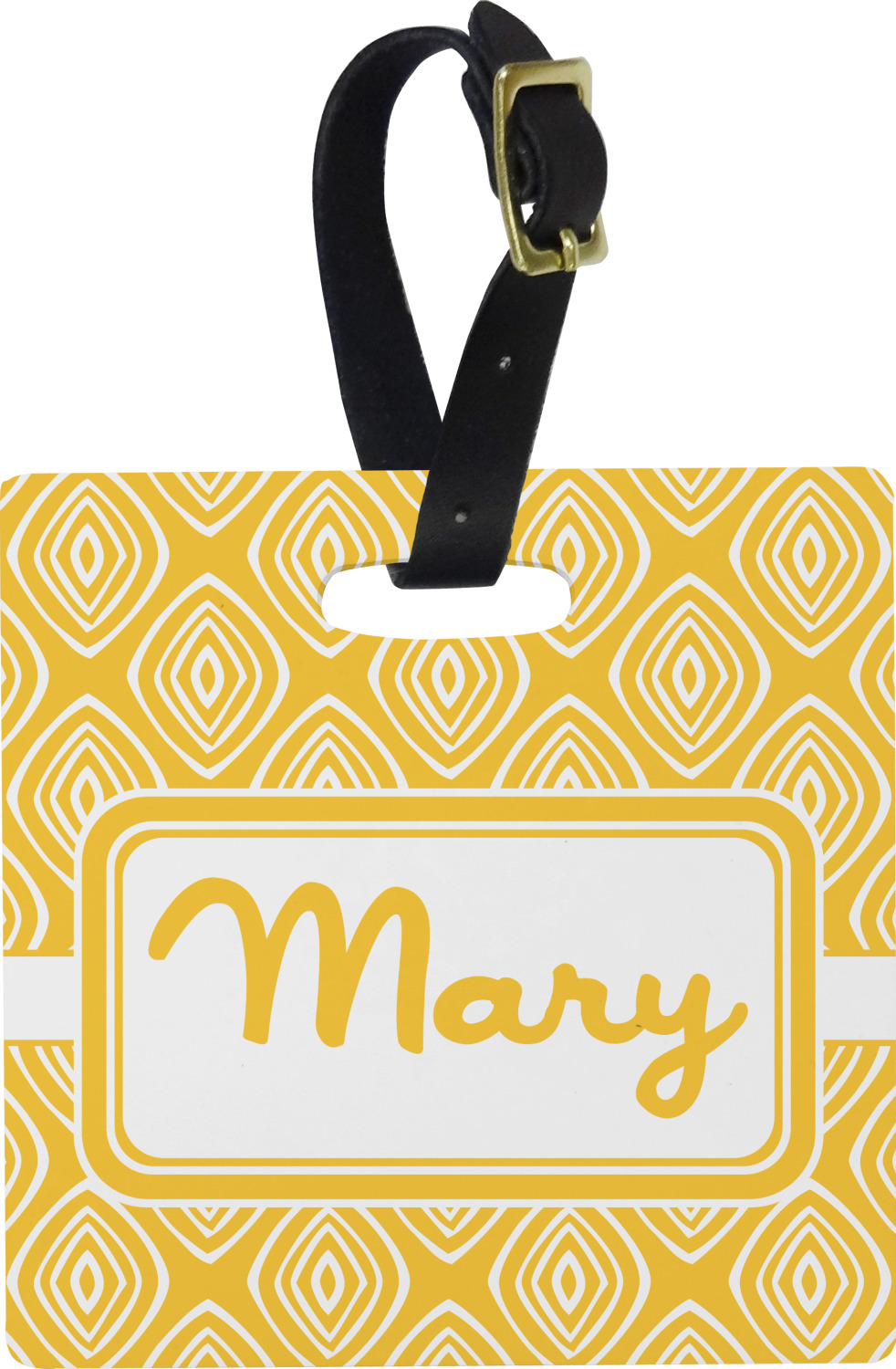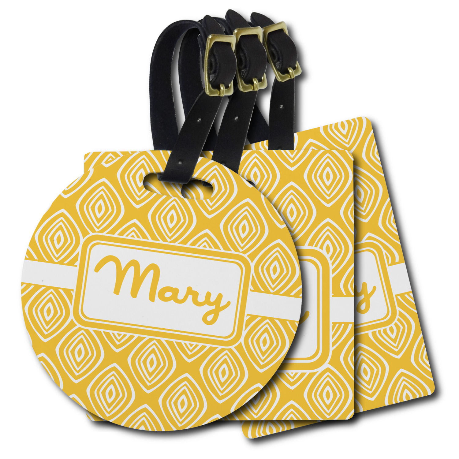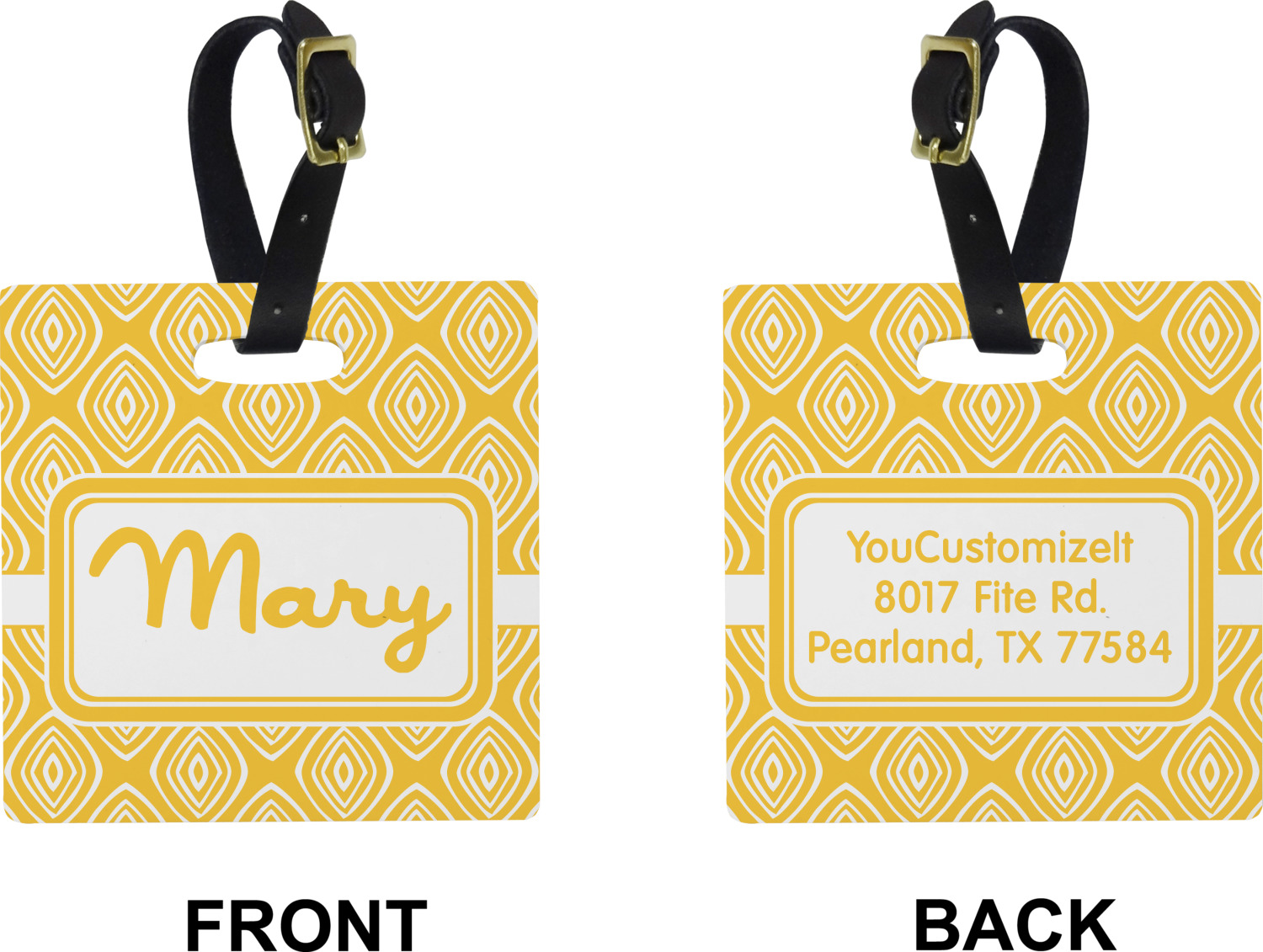 These personalized bag tags are sold in a variety of shapes, so that you may find the product that meets your vision exactly. We sell a round luggage tag, which measures at approximately 4" x 4". Our square luggage tag is about 3.5" x 3.5", while our rectangular version is 2.75" x 4 ".