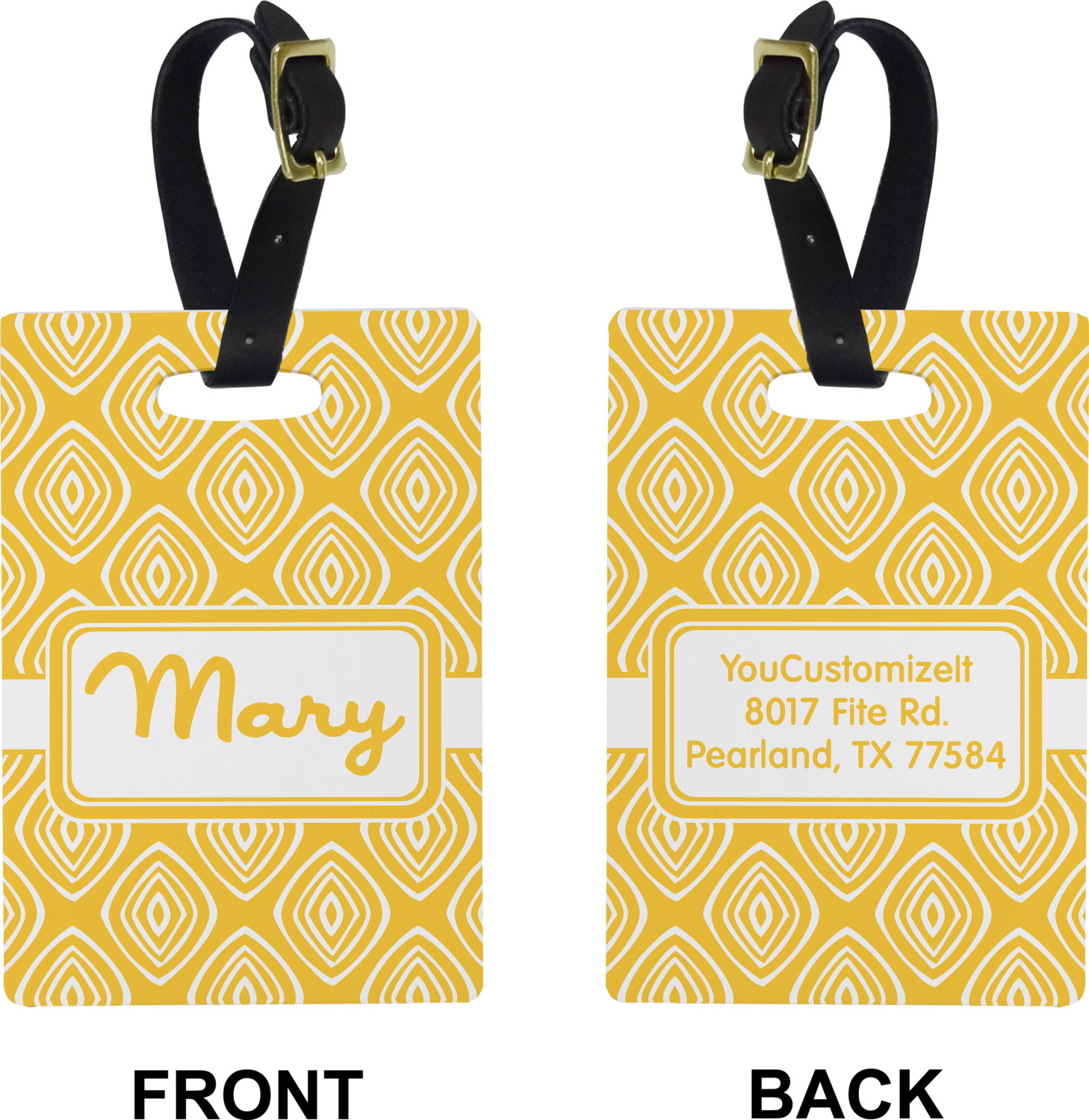 These personalized bag tags are sold in a variety of shapes, so that you may find the product that meets your vision exactly. We sell a round luggage tag, which measures at approximately 4" x 4". Our square luggage tag is about 3.5" x 3.5", while our rectangular version is 2.75" x 4 ".