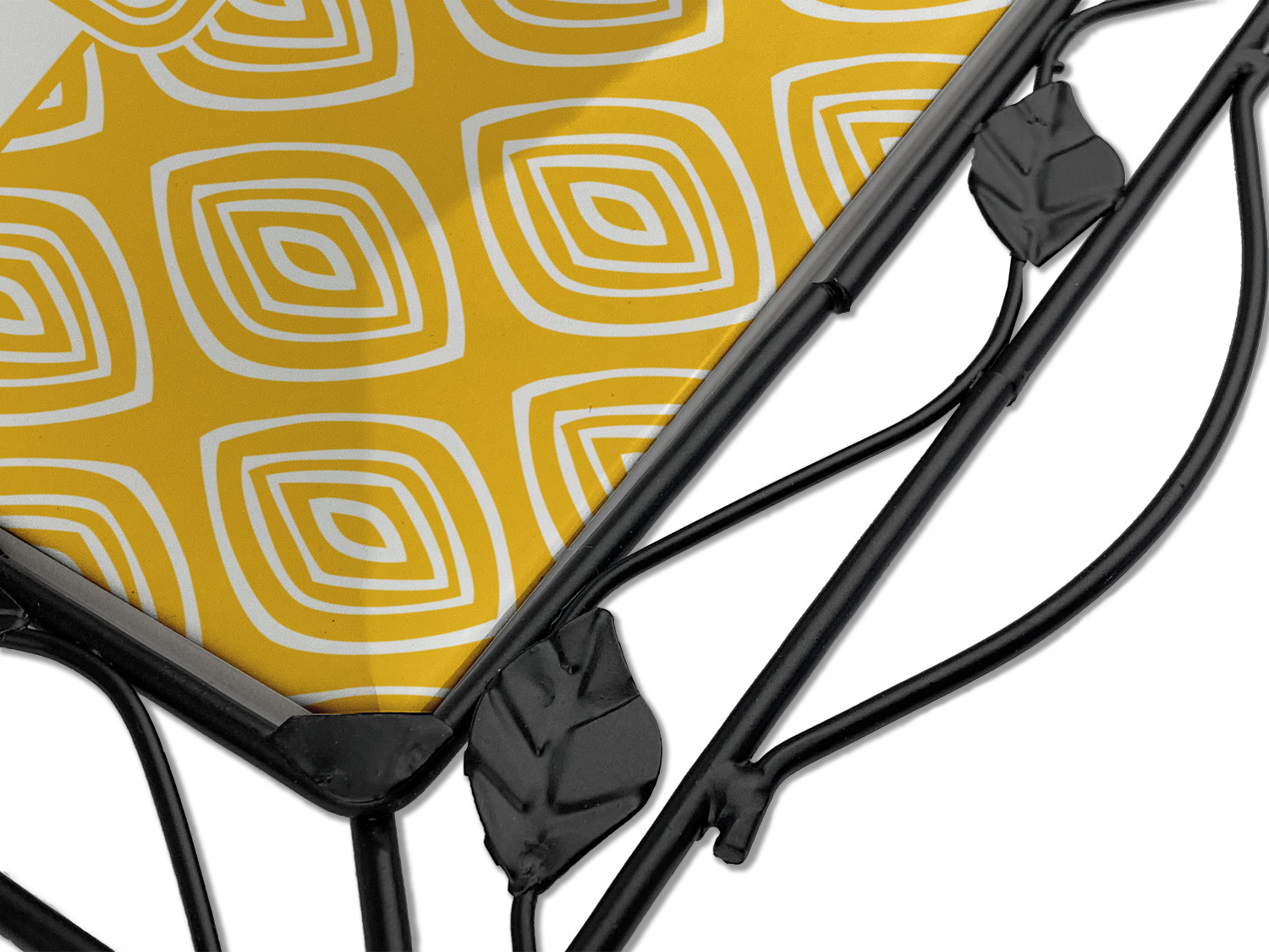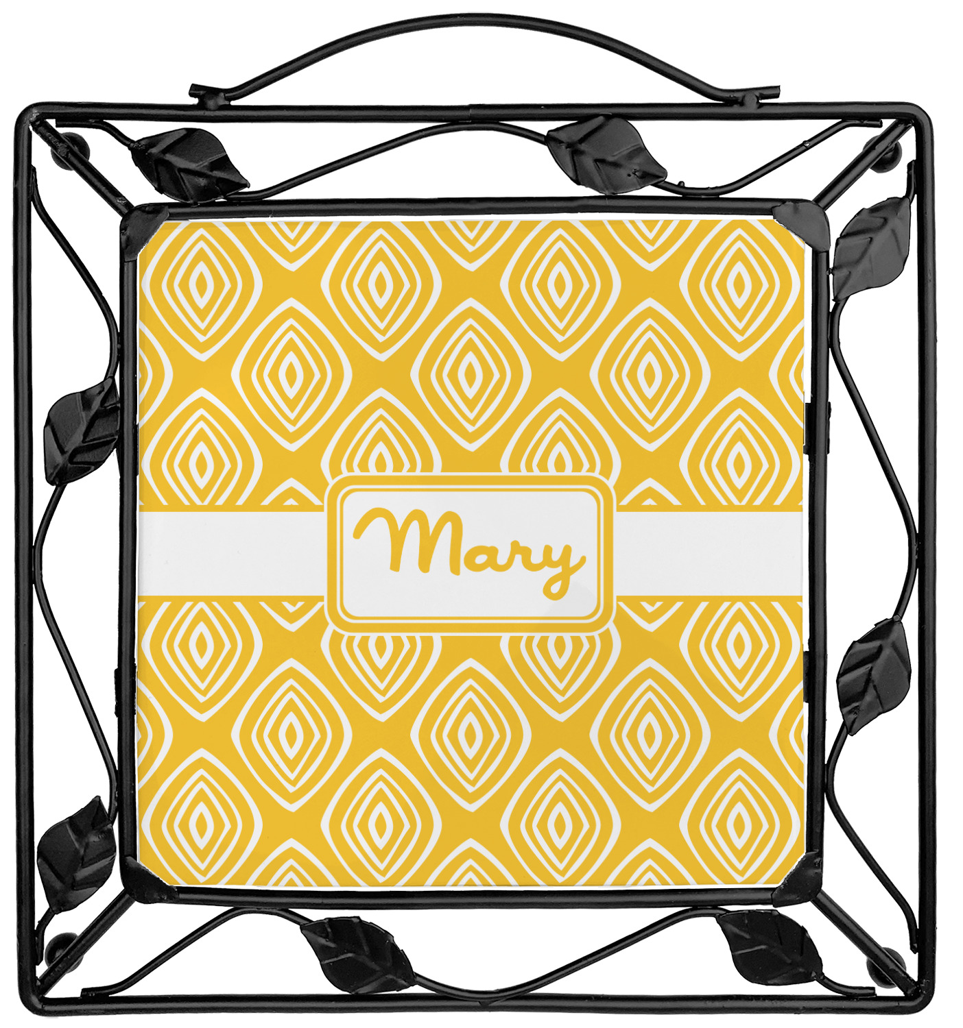 Our square trivets are made from a durable, wrought iron. This model features 4 small half circles, one on each corner, and a larger ring of iron that circles the central, customized tile. Each of the 4 corners has a round foot on its bottom for stability. This trivet is 8.75 by 8.75 inches, but the central tile measures at 6 inches on both sides.