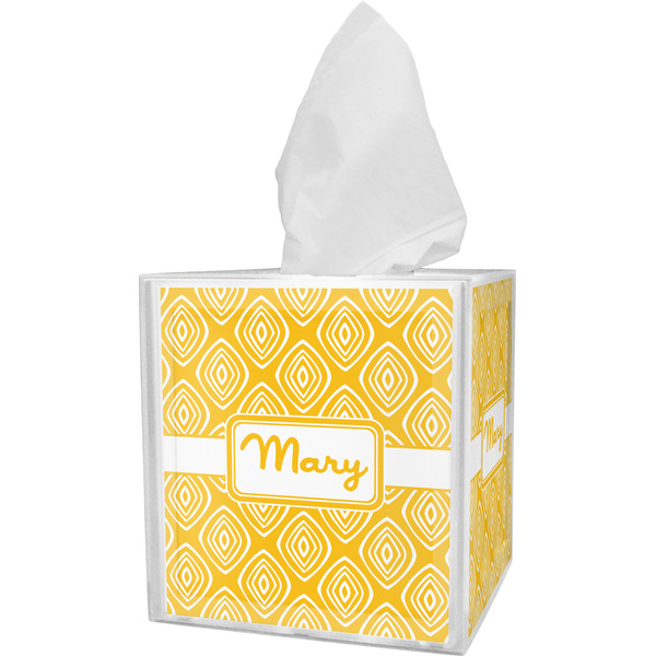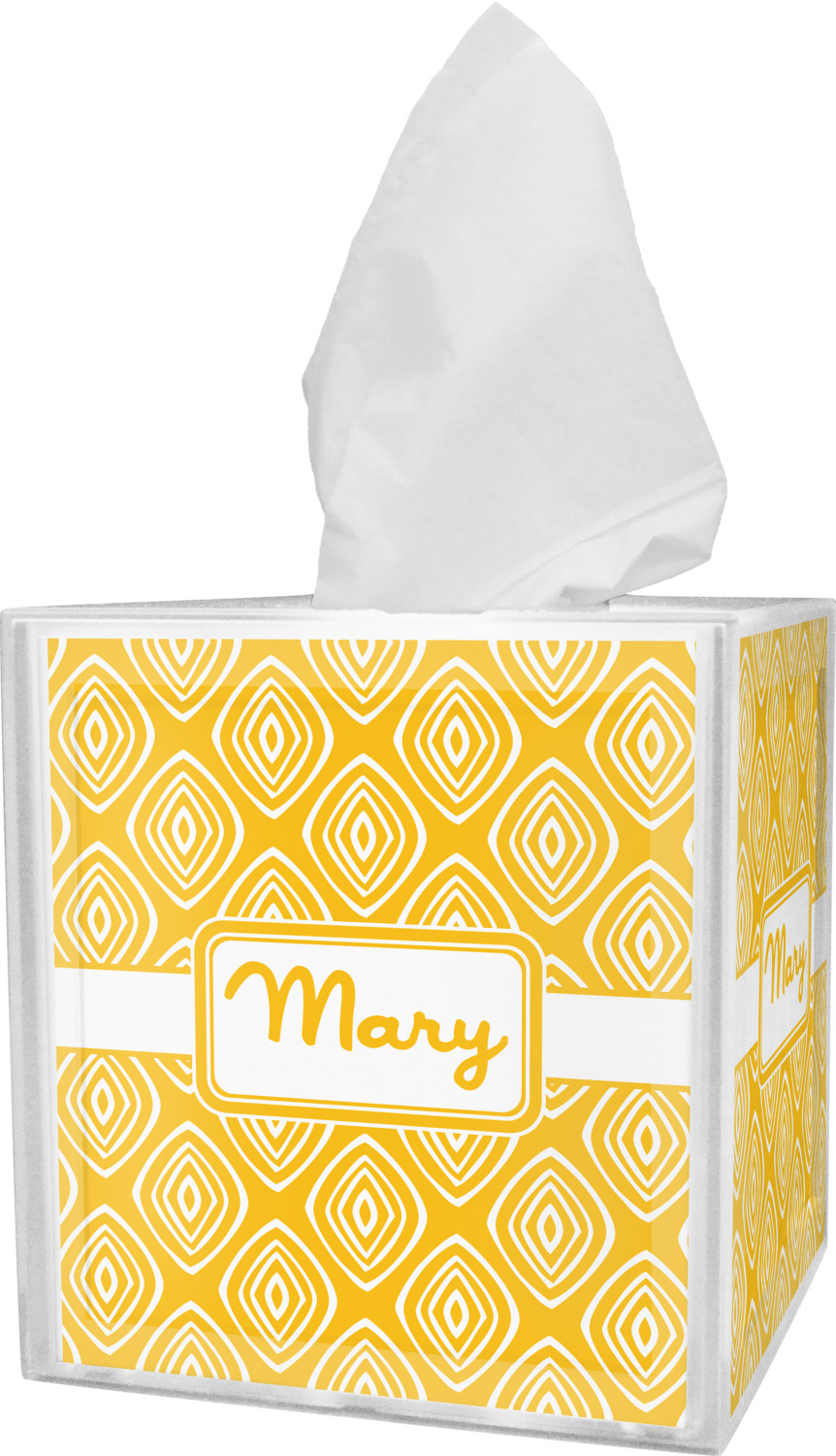 These tissue holders are built from durable acrylic and display your unique personalization on fine-quality vinyl inserts placed within the four sides and top. The box features two pieces, allowing you to easily switch out tissue boxes. On the sides, youll find ridges that ensure the top and base fit securely in place. The bottom of these tissue box holders has four, rubber, non-slip pads to prevent the box from scuffing any surface you decide to display it on. Each box can fit a standard 5 by 5-inch box of tissues.