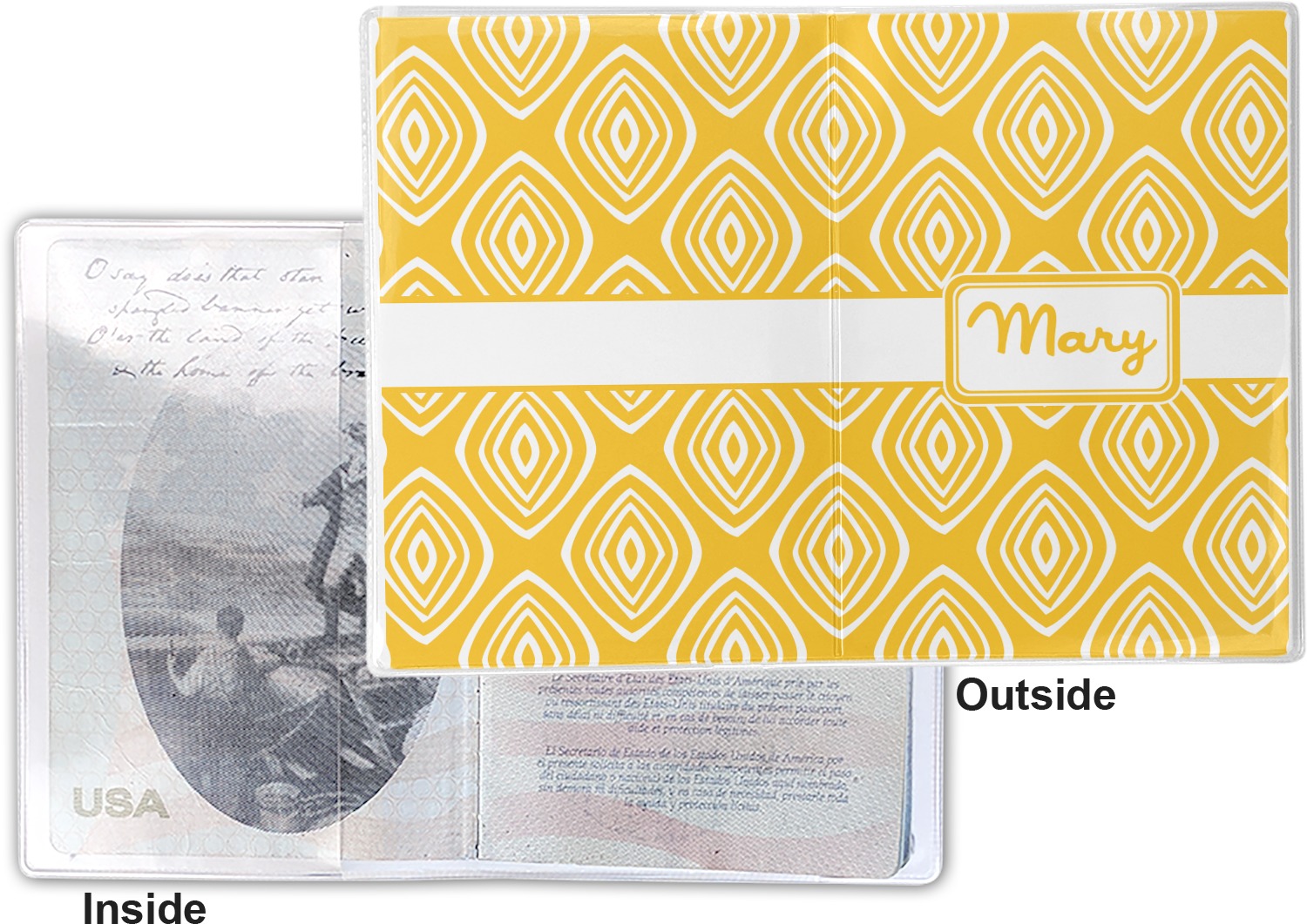 This cover is made of a sturdy clear vinyl with a personalized vinyl insert inside. There is a large and a small pocket on either side to hold the covers of your passport easily and firmly. The passport holder is approximately 7.5" x 5.25", the perfect size to snugly fit your passport. This slim cover is the perfect way to protect your passport without being one more bulky item you have to carry.