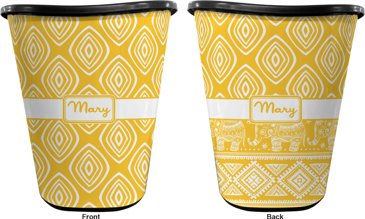 You can choose to purchase these decorative wastebaskets in either a white or a black color that will show on the base and the upper rim. Your customization is printed on a high-gloss, fine-quality vinyl adhesive, and you can choose to either have this adhesive applied to one side only or to both sides. As such, this plastic wastebasket can be single-sided or double-sided, depending on your creative vision. Your customization is printed using durable inks, making the design waterproof and resistant to fading over time.