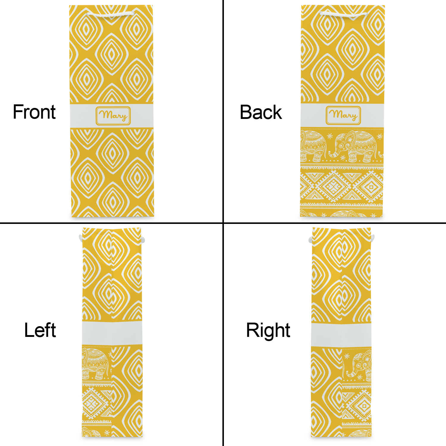 Our wine bags are printed on premium paper. The bags are then cut, scored and folded. The handles and cardstock base it attached. These custom wine bags are printed and made in the USA.