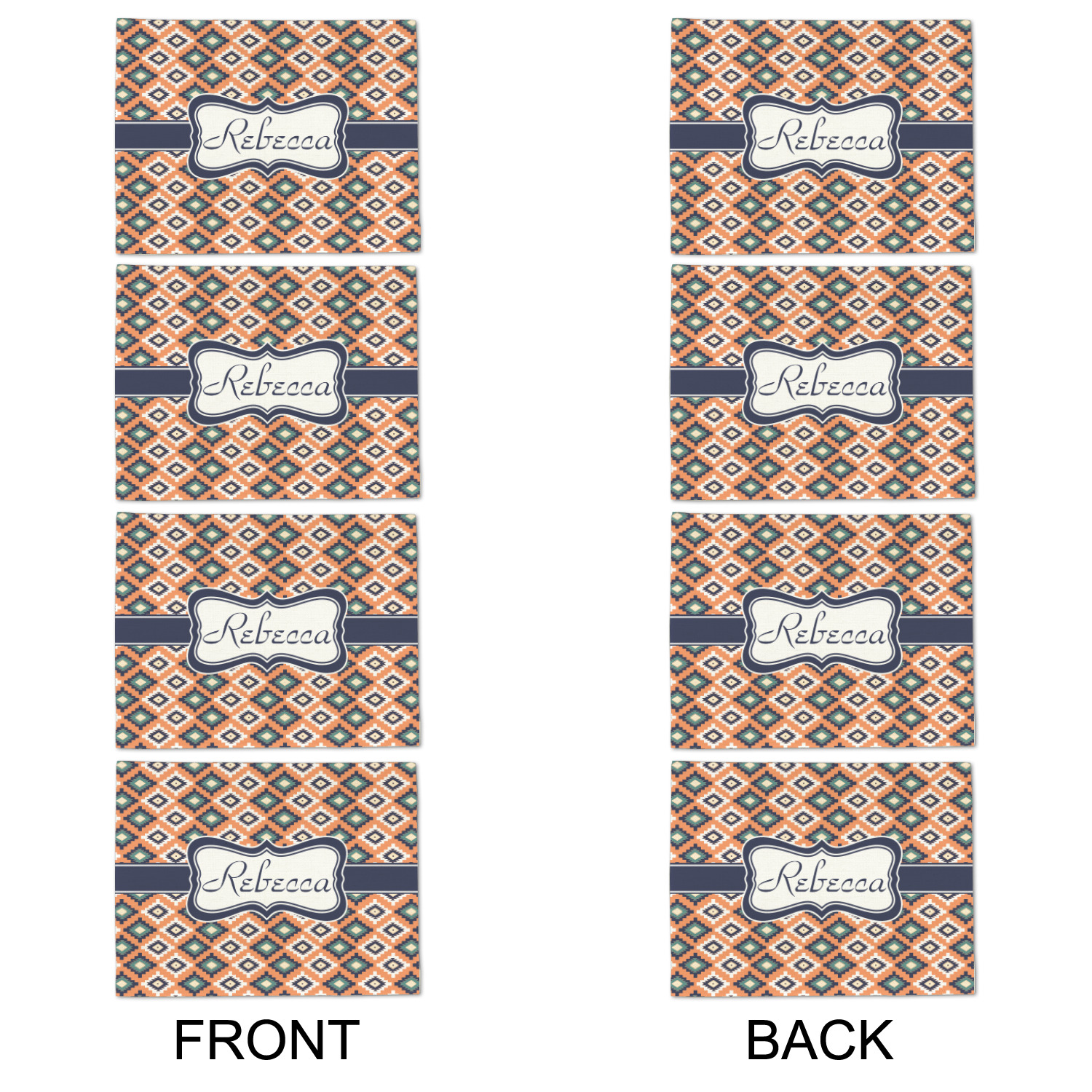 This fun, tribal design features stitched diamonds in cream and blue, scattered across a pale orange background. The effect is rather mesmerizing.