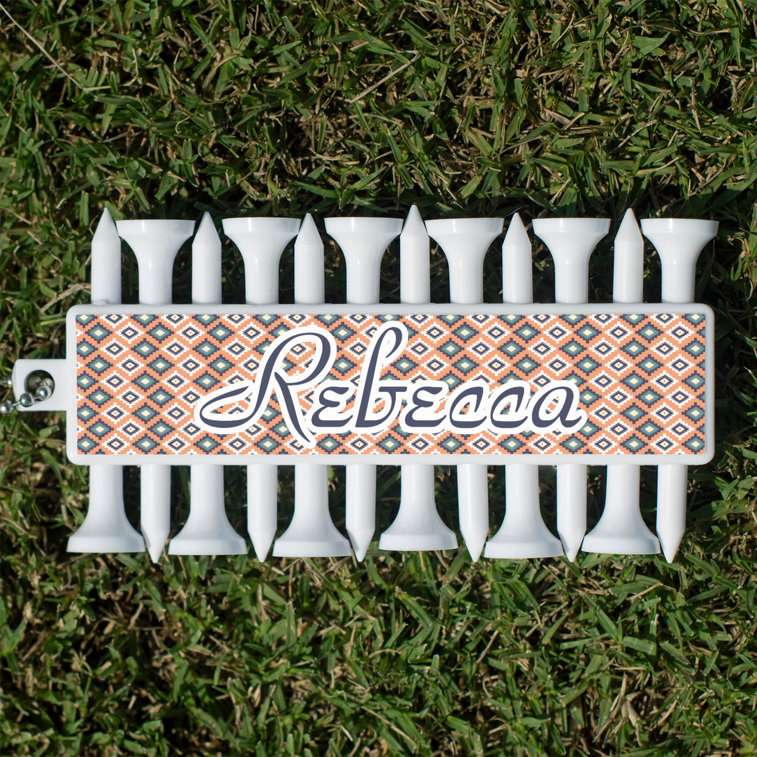 This fun, tribal design features stitched diamonds in cream and blue, scattered across a pale orange background. The effect is rather mesmerizing.
