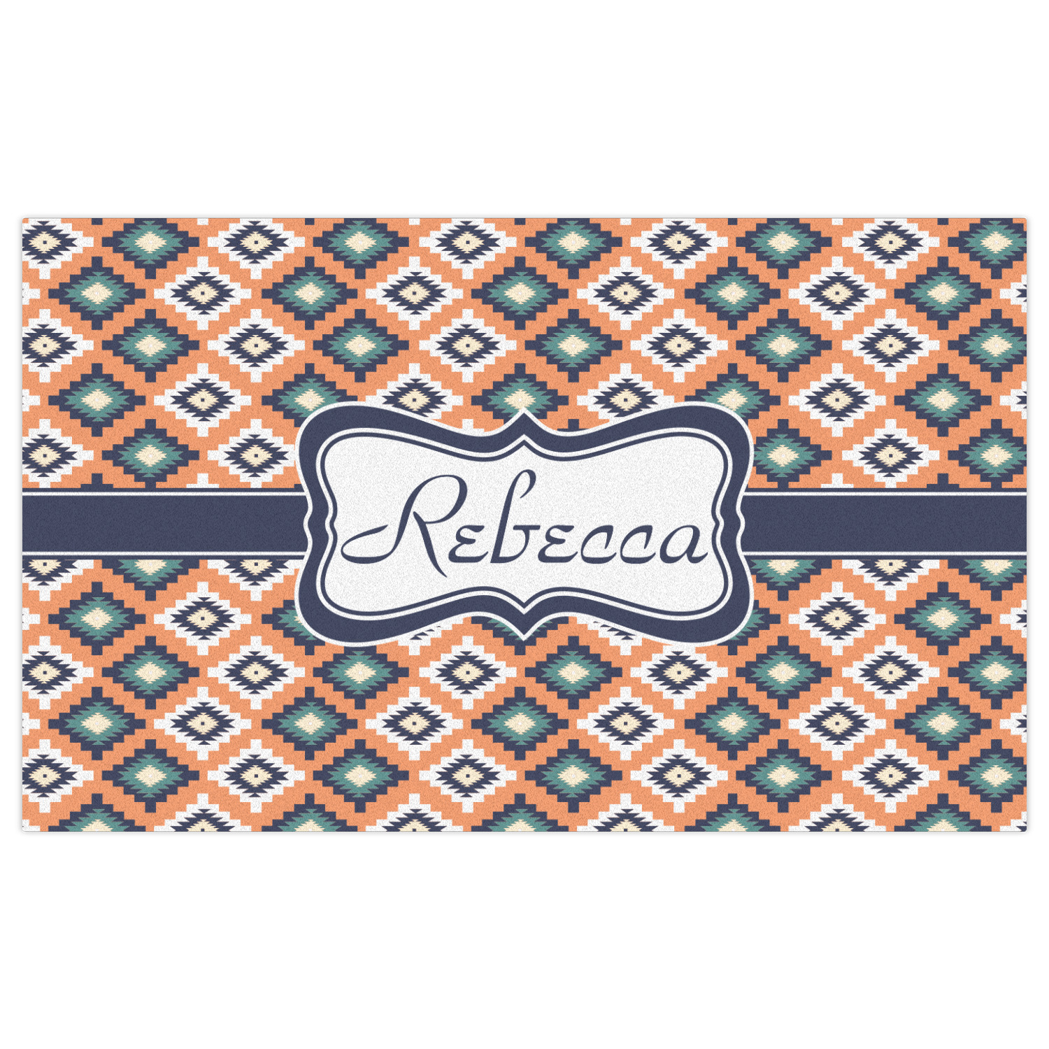 This fun, tribal design features stitched diamonds in cream and blue, scattered across a pale orange background. The effect is rather mesmerizing.
