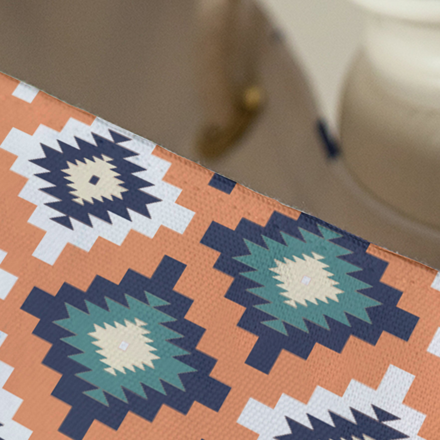 This fun, tribal design features stitched diamonds in cream and blue, scattered across a pale orange background. The effect is rather mesmerizing.