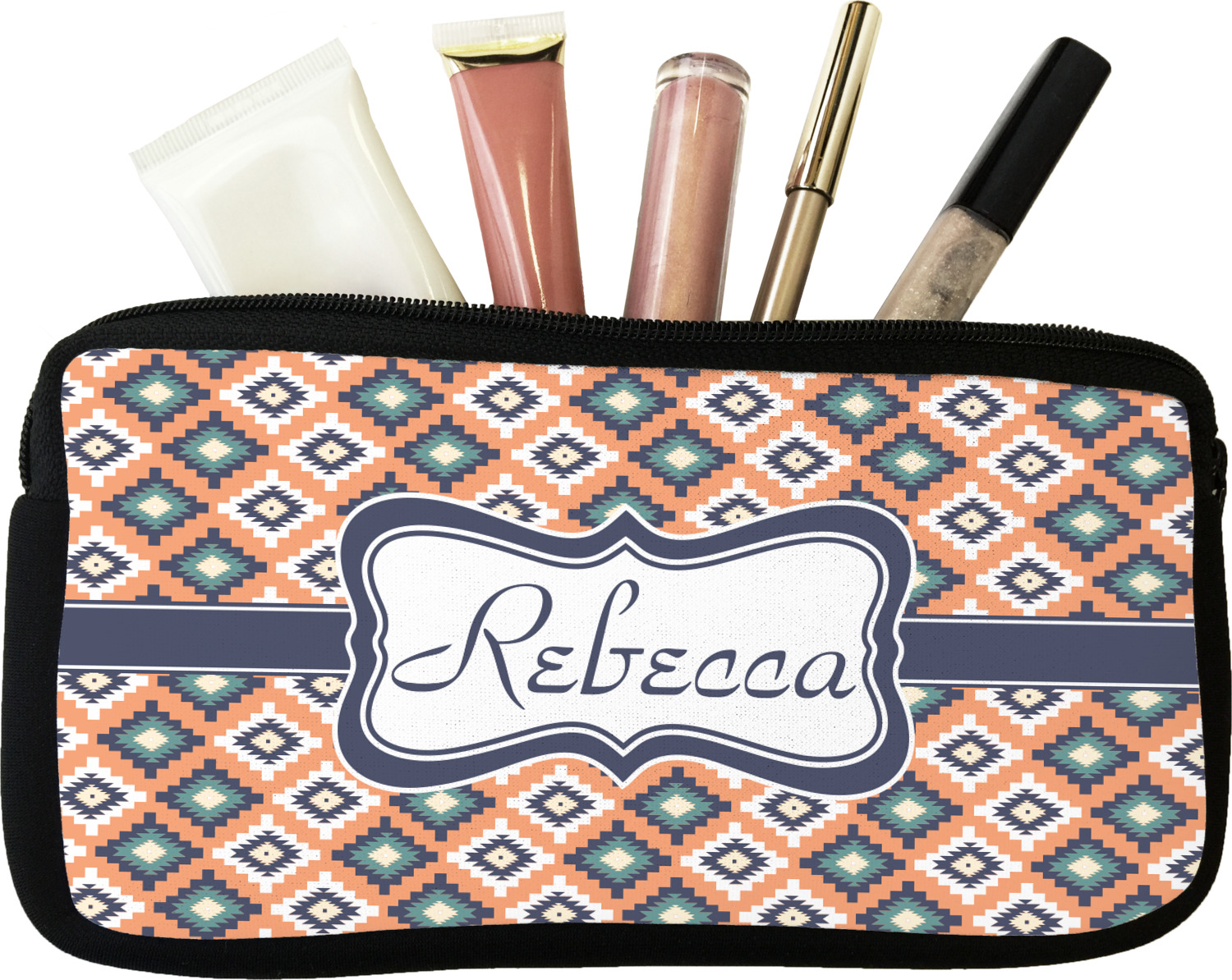 Our personalized makeup bags are available in many different designs, patterns and colors - so you are sure to find one that will love. They are made of neoprene (same material as wet-suits) and thus are water resistant, so spillages in your makeup bag will not end up all over you purse. They are customized on one side and are black on the other side and the zipper is black as well.