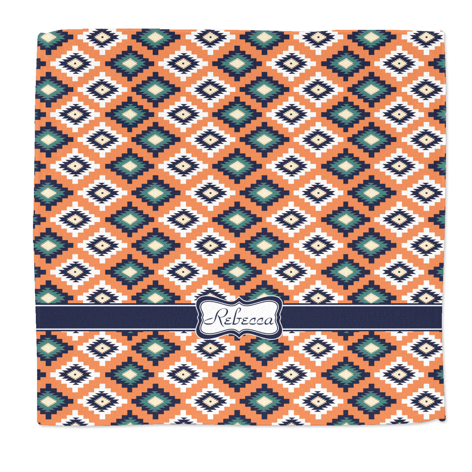 This fun, tribal design features stitched diamonds in cream and blue, scattered across a pale orange background. The effect is rather mesmerizing.