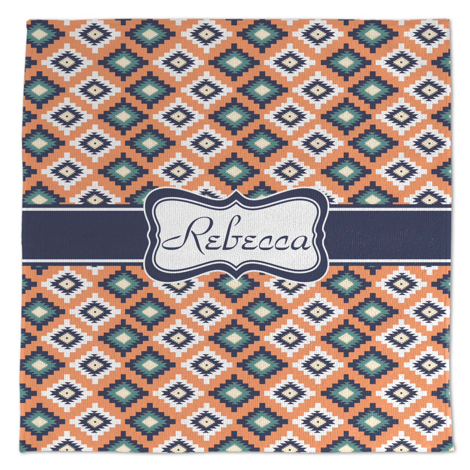This fun, tribal design features stitched diamonds in cream and blue, scattered across a pale orange background. The effect is rather mesmerizing.