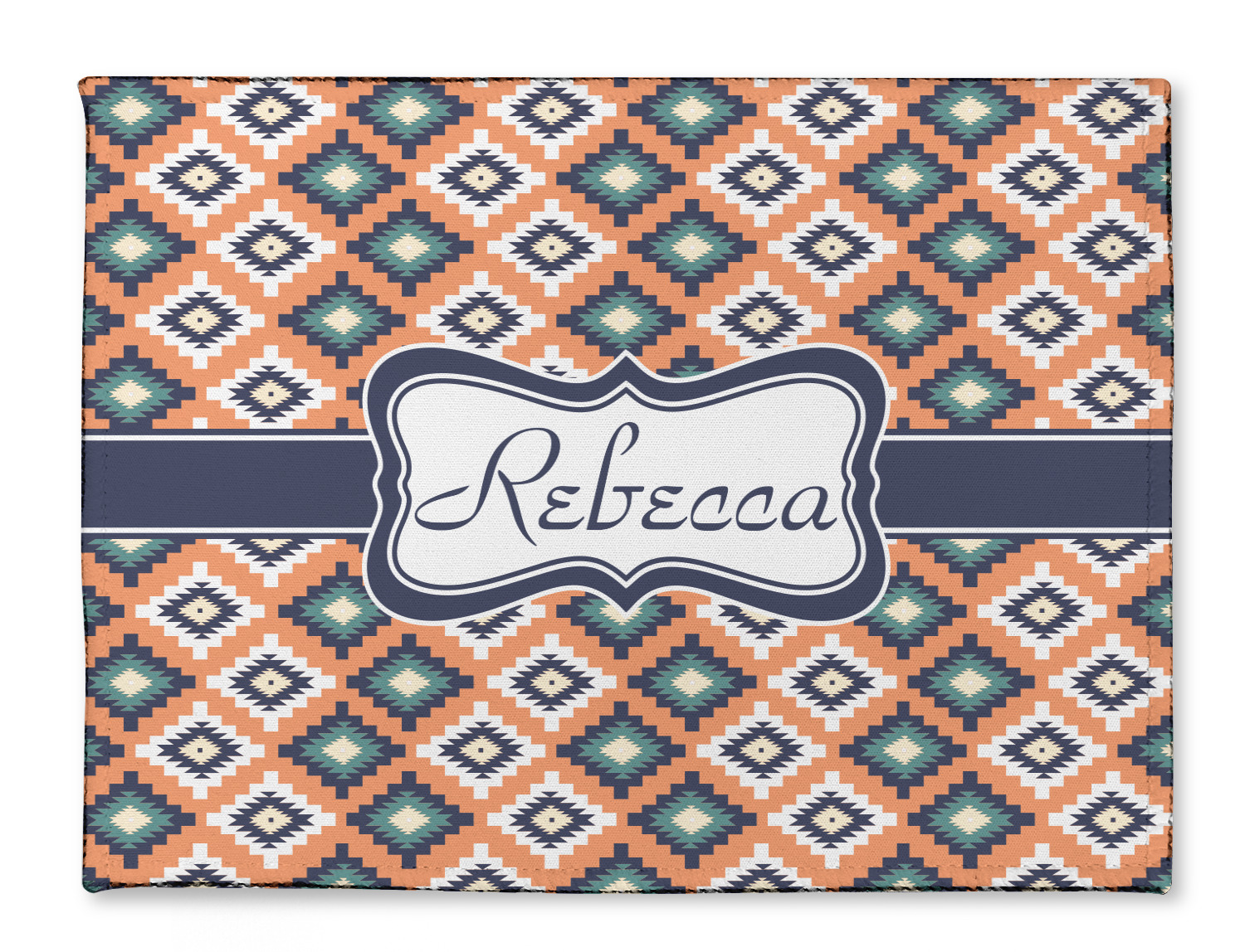 This fun, tribal design features stitched diamonds in cream and blue, scattered across a pale orange background. The effect is rather mesmerizing.