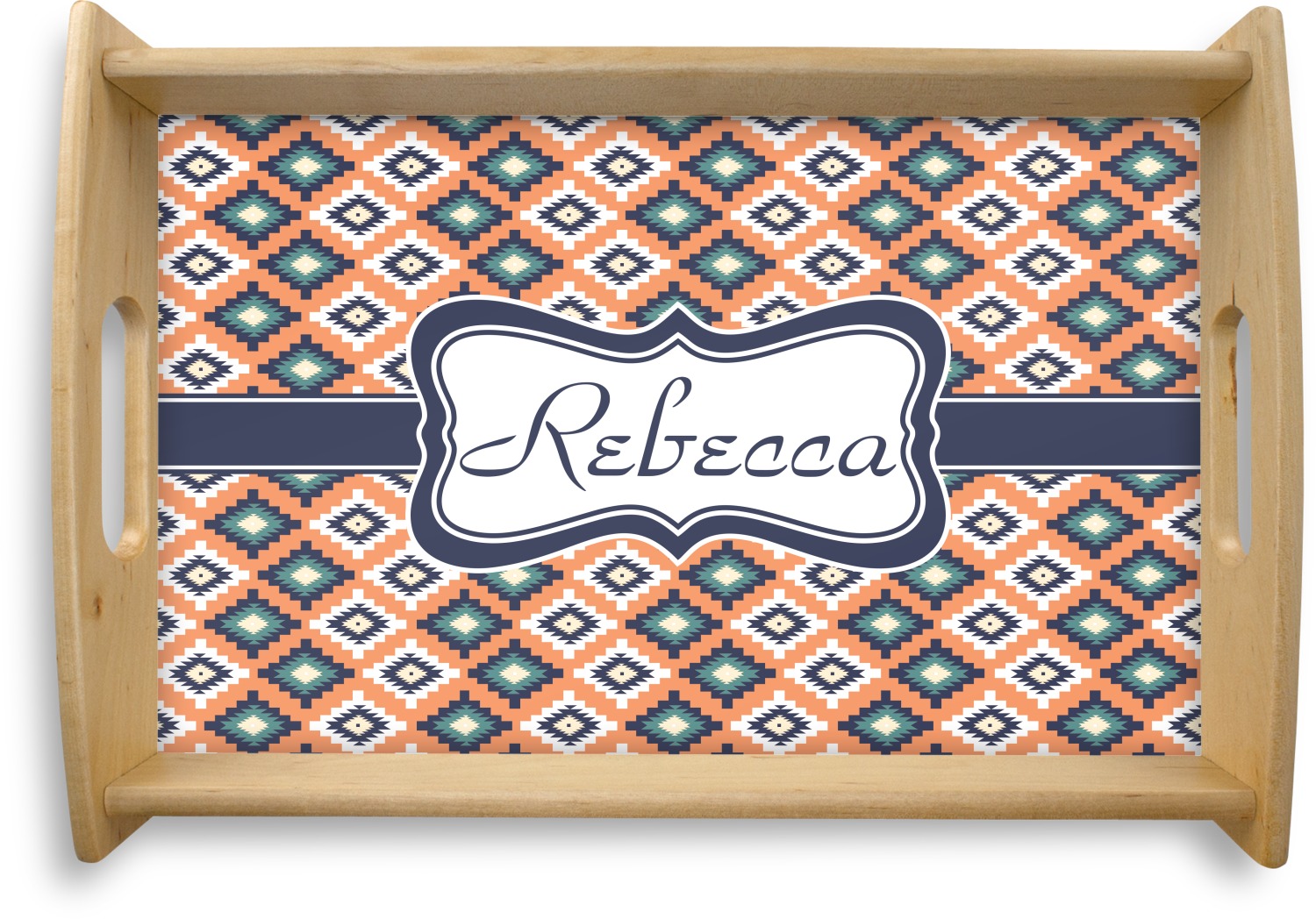 This serving tray with handles features square edges and two rounded sides, creating a very modern look. Each side is fabricated from a beautifully cut, natural wood. The bottom of the interior of the tray displays your customized design in bright, vibrant color. The tray is sold in both a black color and a natural wood look. Each variation of the wood serving tray has two sizes: Small, which is 14" x 10" x 2.25", and Large, which is 19.5" x 13.5" x 2.75".