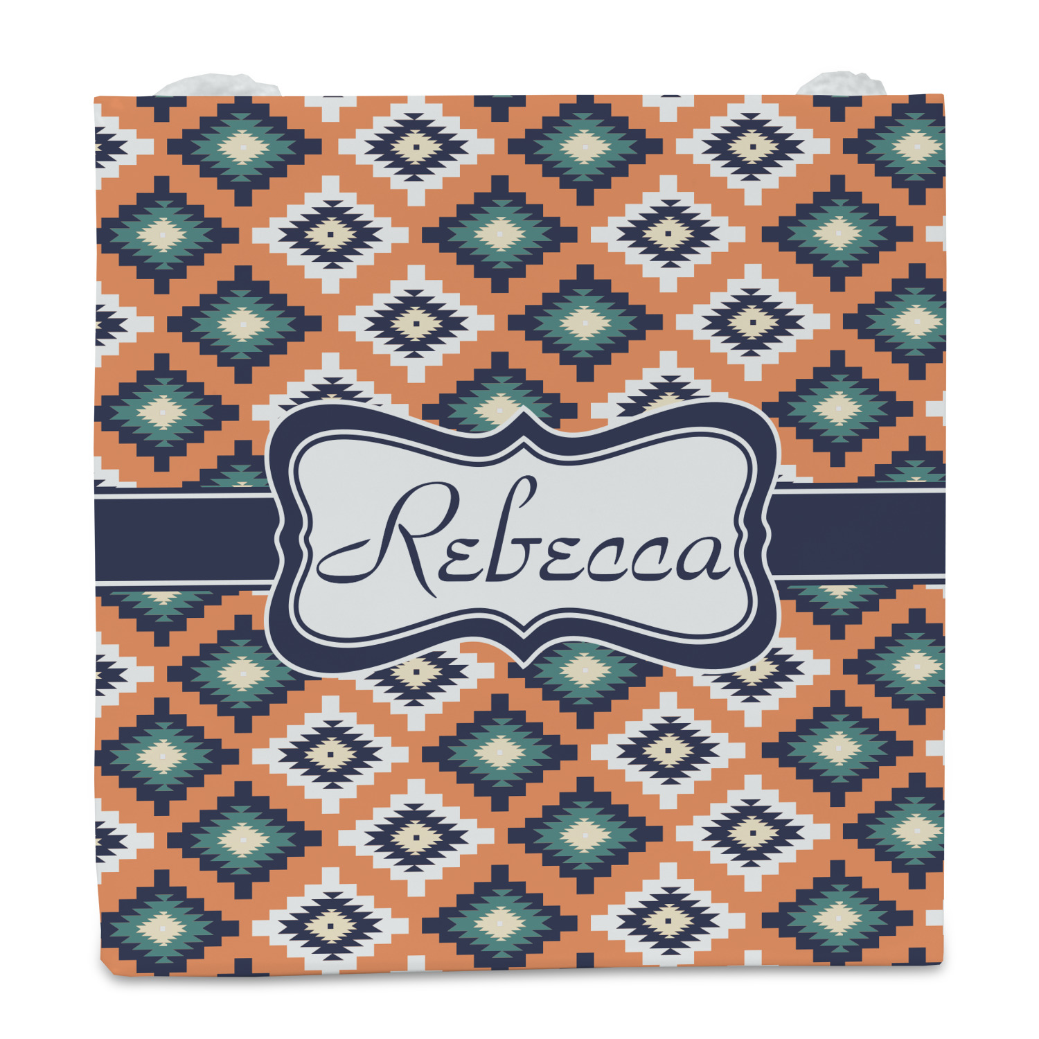 This fun, tribal design features stitched diamonds in cream and blue, scattered across a pale orange background. The effect is rather mesmerizing.