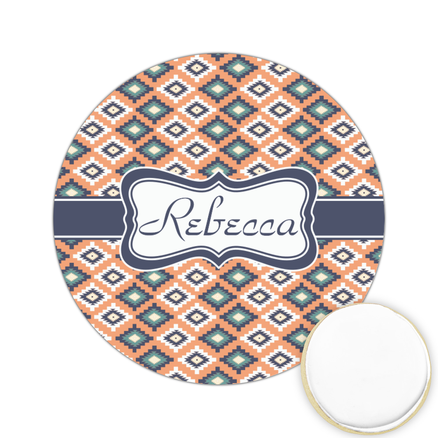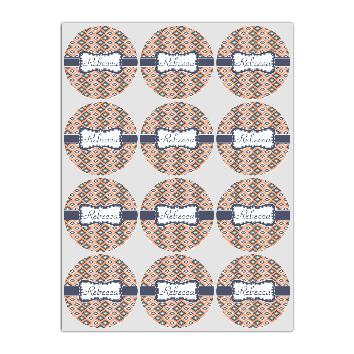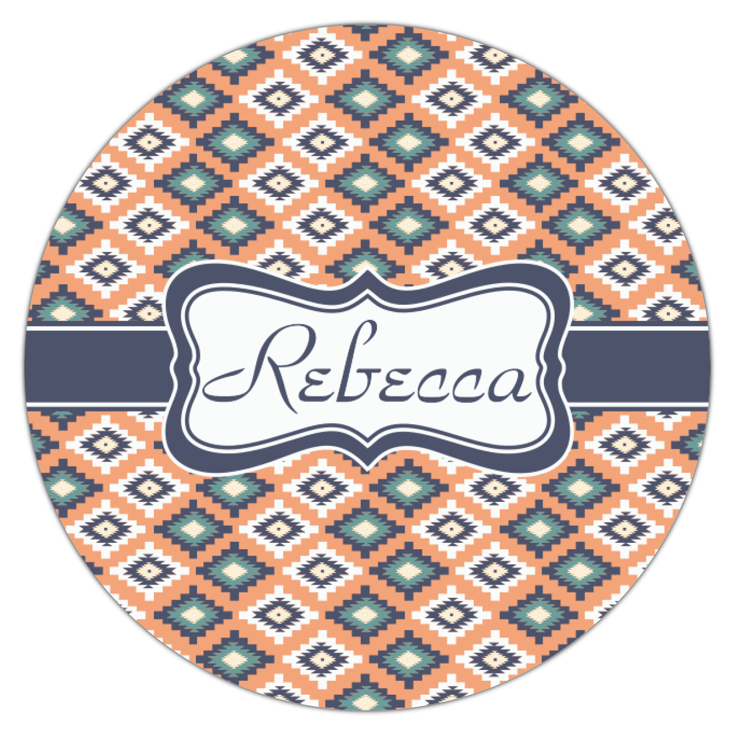 This fun, tribal design features stitched diamonds in cream and blue, scattered across a pale orange background. The effect is rather mesmerizing.